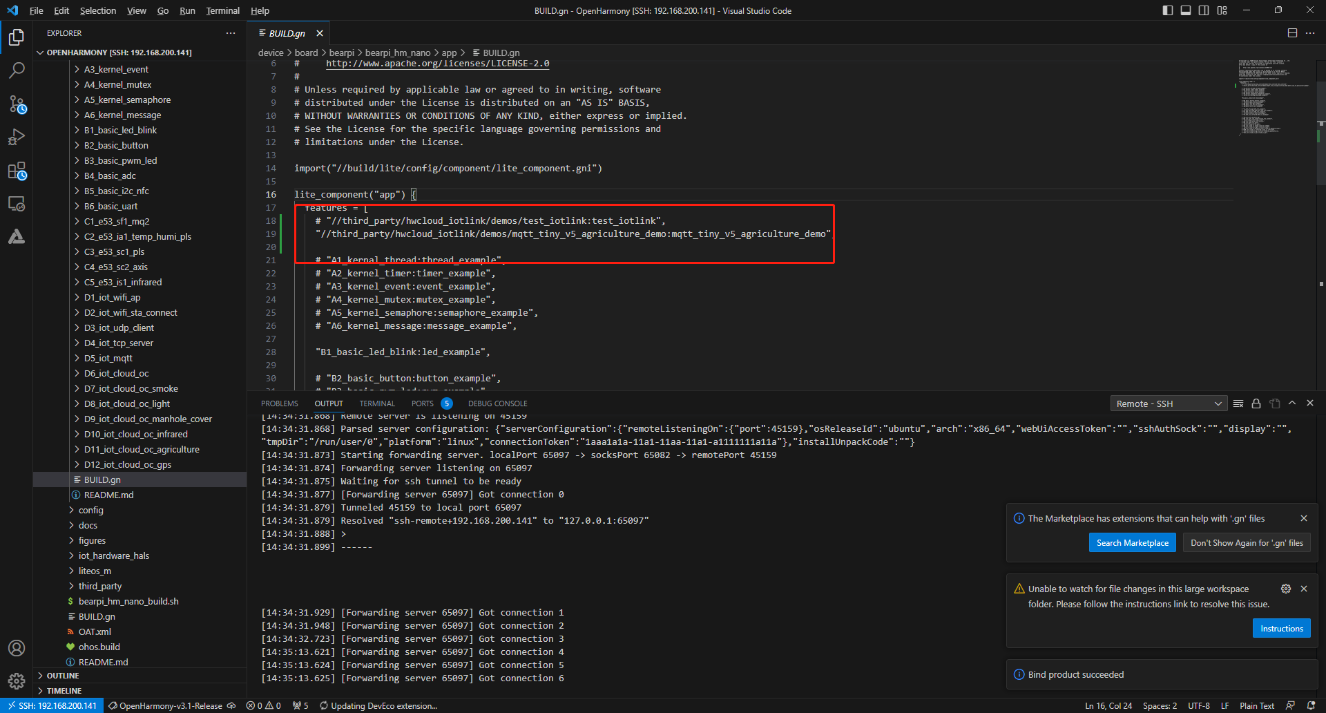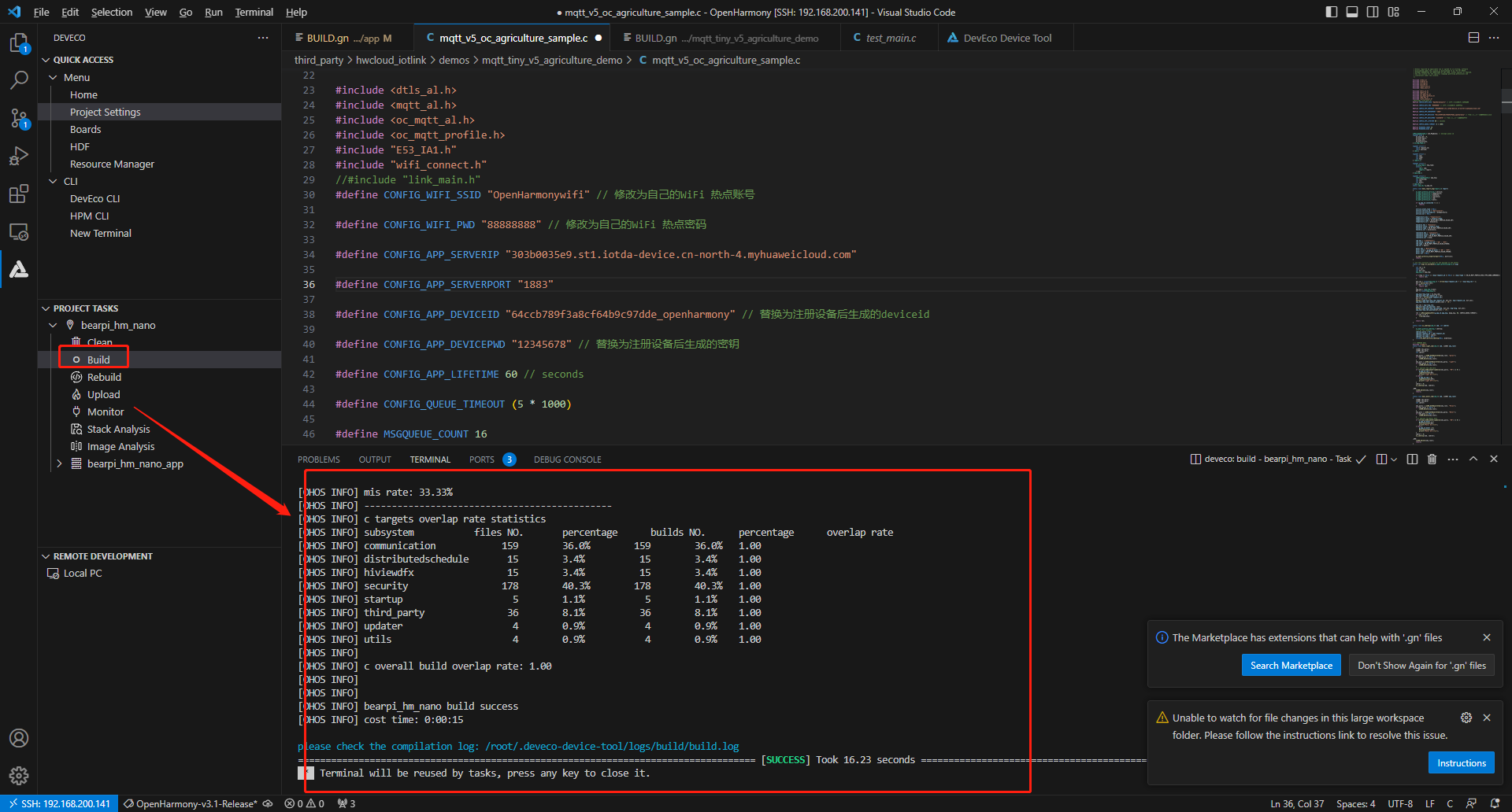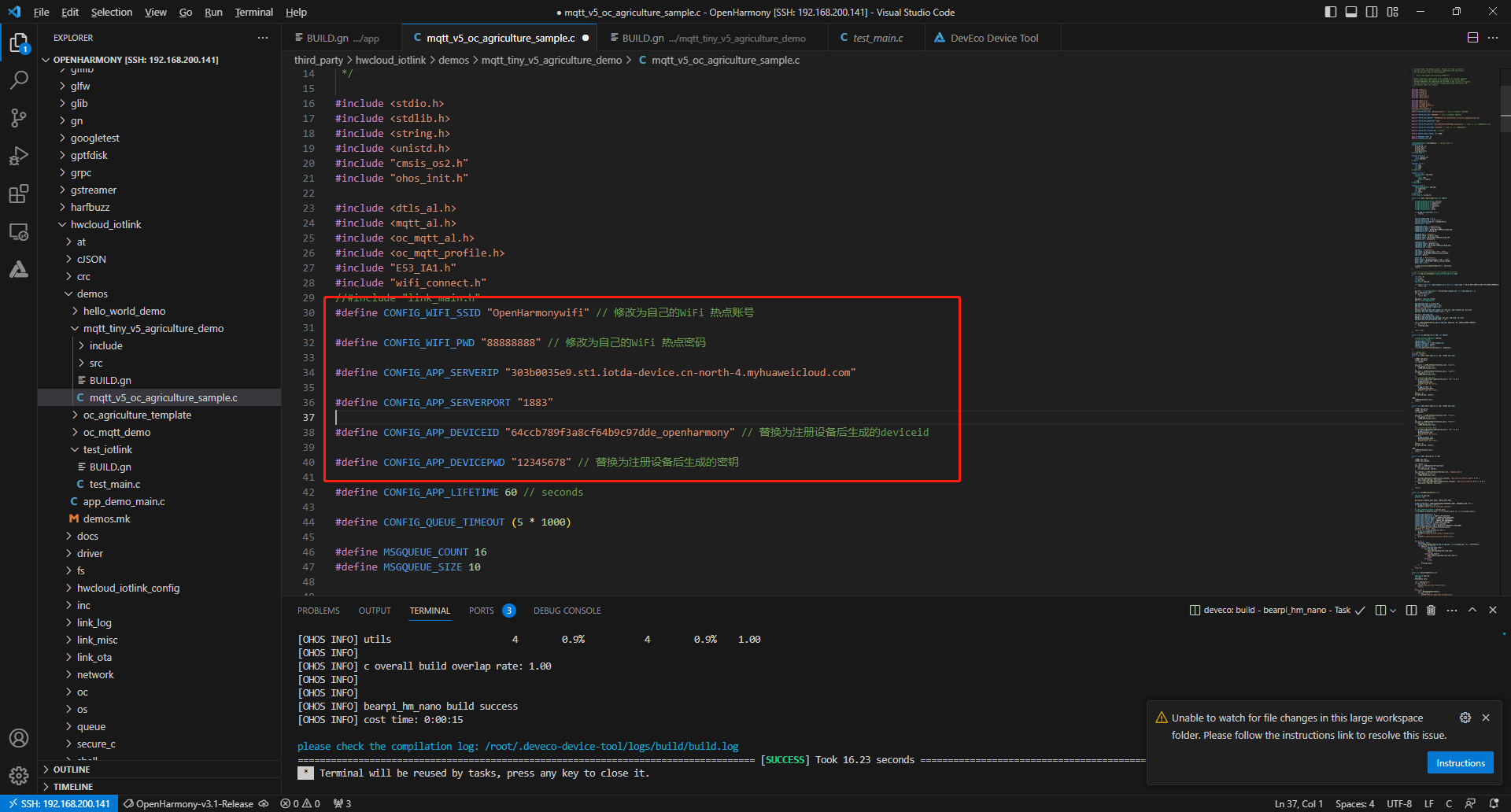 设置参数,打开:/root/OpenHarmony/code-v3.1-Release/OpenHarmony/third_party/hwcloud_iotlink/demos/mqtt_tiny_v5_agriculture_demo/mqtt_v5_oc_agriculture_sample.c文件