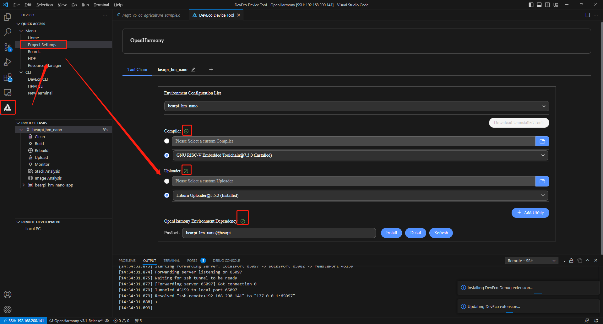 在菜单栏中点击Project Settings,进入BearPi-HM Nano工程配置界面,在Tool Chain页签中,DevEco Device Tool会自动检测依赖的编译工具链是否完备,击Download Uninstalled Tools,自动安装所需工具,或单击工具后方的Download安装指定工具。OpenHarmony Environment Dependency”的状态异常,请单击Install安装。