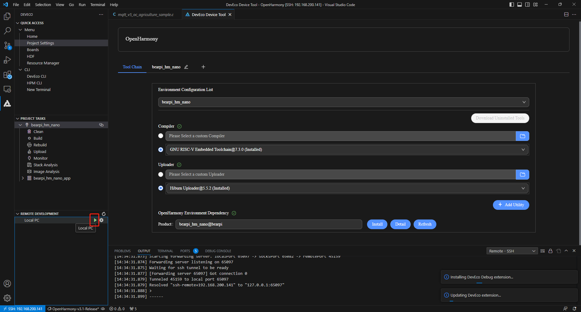 在DevEco Device Tool中,选择REMOTE DEVELOPMENT > Local PC,查看远程计算机(Ubuntu开发环境)与本地计算机(Windows开发环境)的连接状态