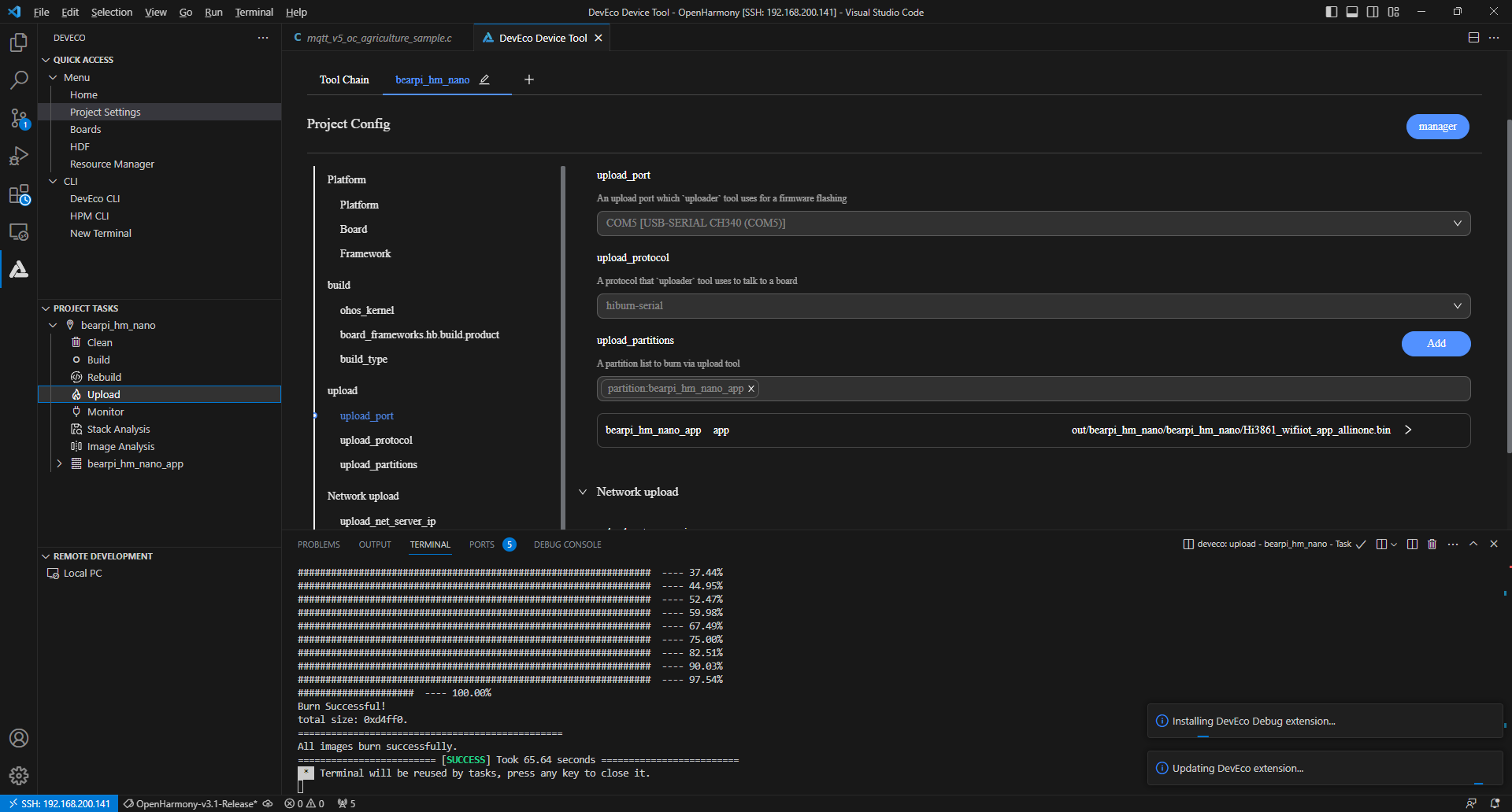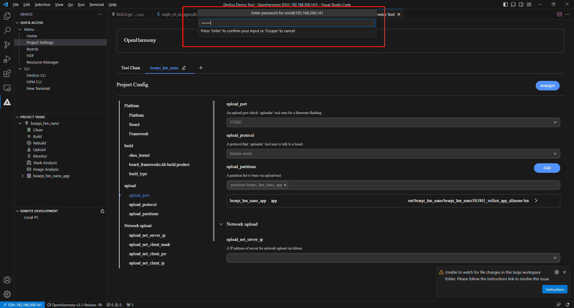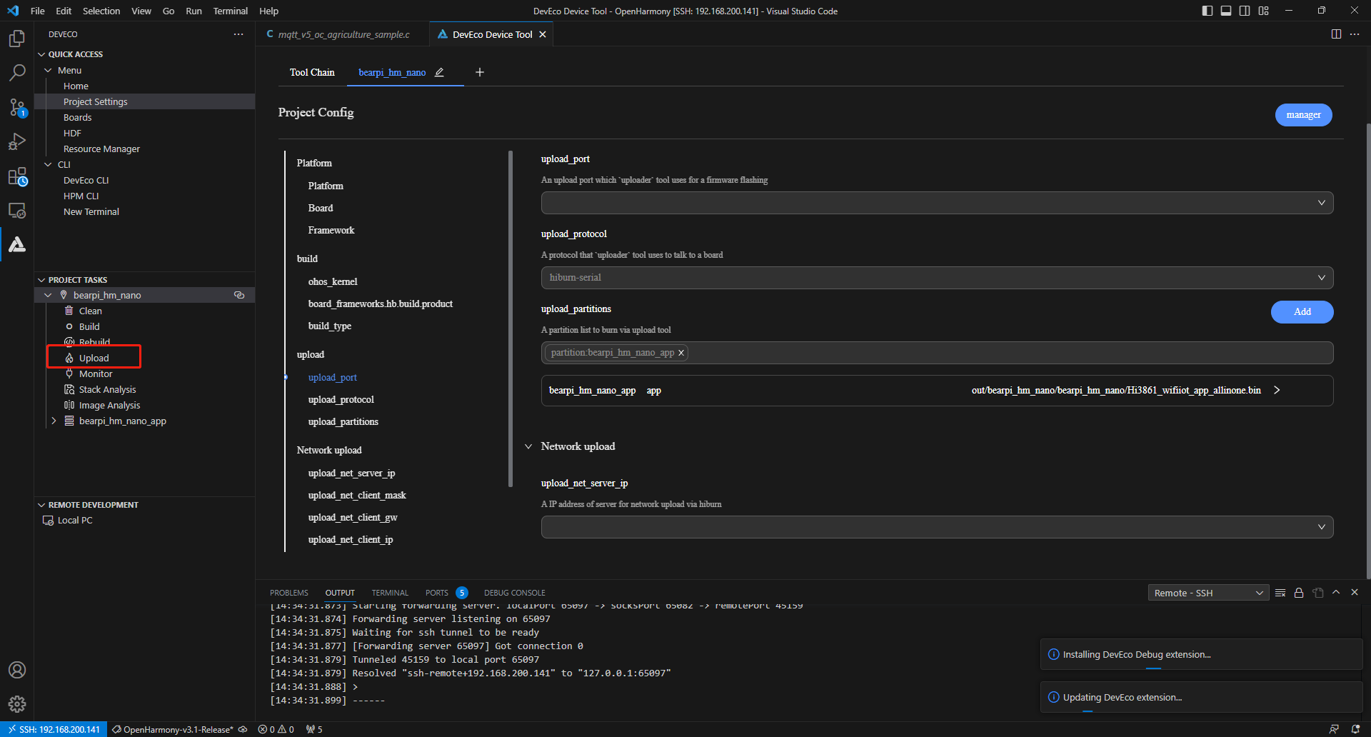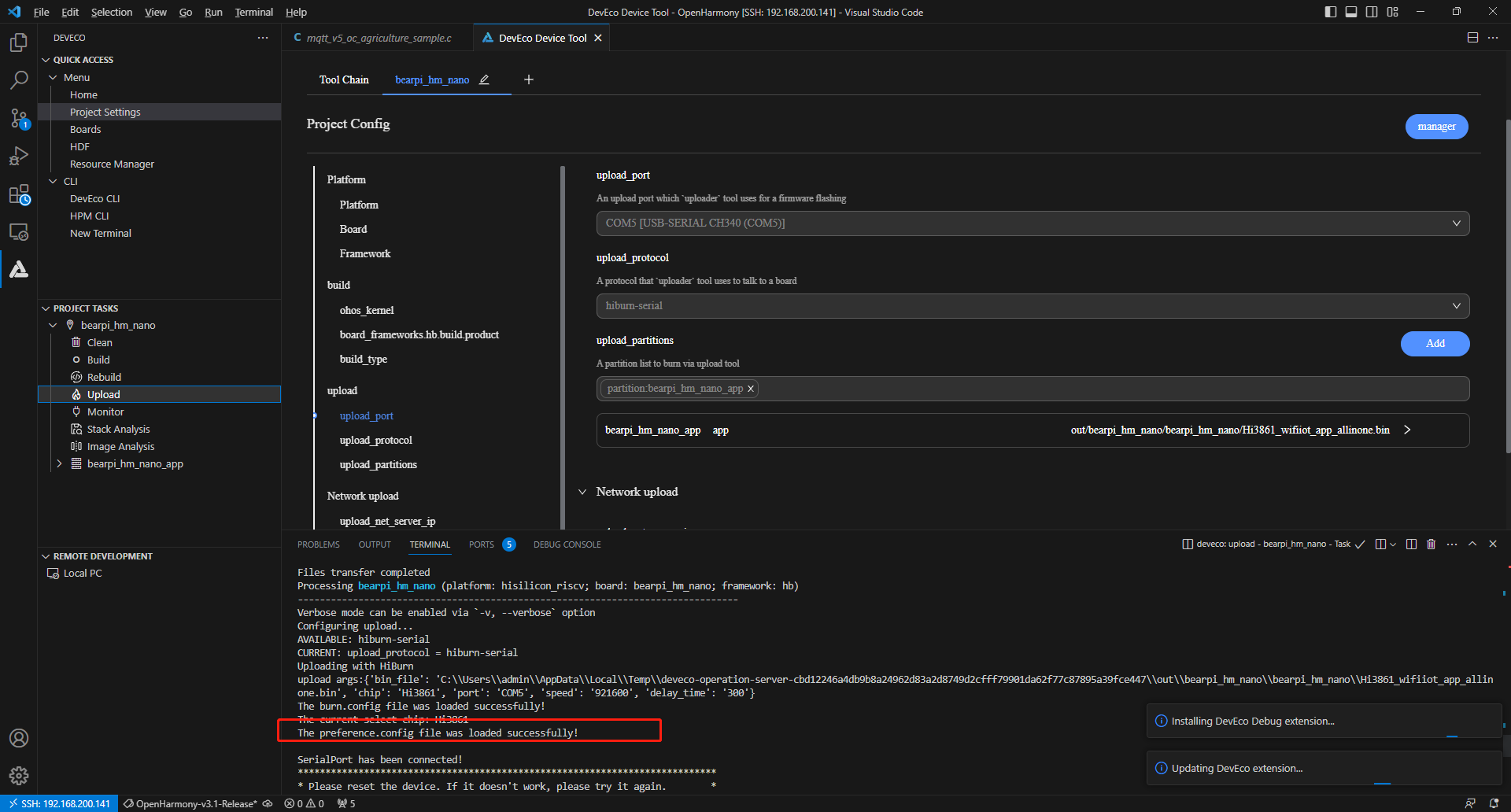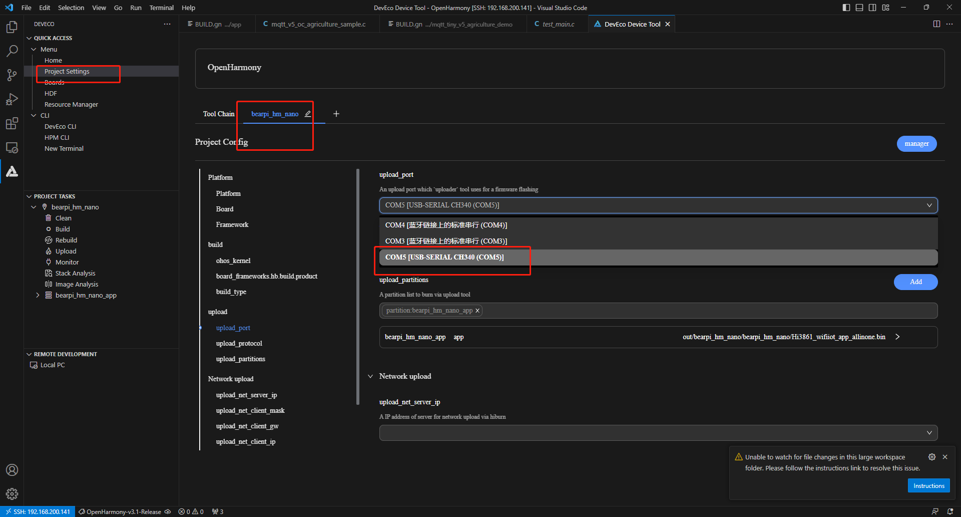 在bearpi_hm_nano页签,设置烧录选项,包括upload_port、upload_partitions和upload_protocol。配置完成后工程将自动保存