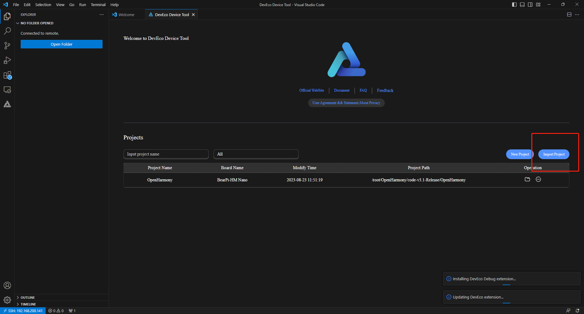 先确保已经通过remote-ssh链接到了虚拟机服务器中,进入Home页,点击Import Project打开工程