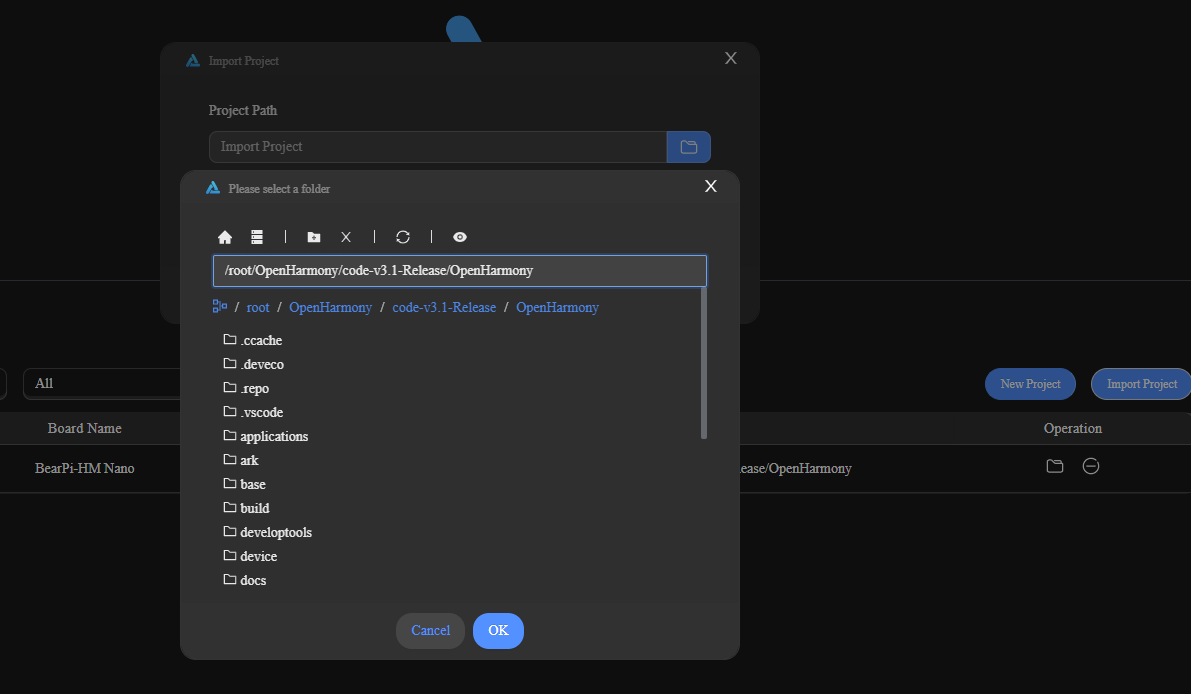 选择OpenHarmony源码根目录路径,然后再选择Import OpenHarmony Source选项,点击Import进行导入