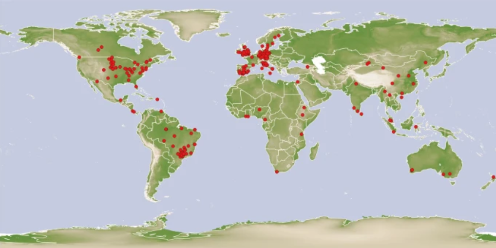 巴西 • 耕地环境 • 加拿大 • 美利坚合众国 • 新西兰 • 意大利 • 德国 • 喀麦隆 • 印度 • 斯里兰卡 • 委内瑞拉 • 丹麦王国 • 爱尔兰共和国 • 法兰西共和国 • 英国 • 西班牙王国 • 哥斯达黎加 • 埃塞俄比亚• 加纳• 印度尼西亚• 墨西哥• 尼日利亚• 南非共和国• 葡萄牙共和国• 中国• 马来西亚• 土耳其• 以色列• 瑞典• 意大利• 格鲁吉亚• 波多黎各• 坦桑尼亚• 澳大利亚 |