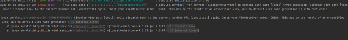 Circular view path [test]: would dispatch back to the current handler URL [/boot/test] again. Check your ViewResolver setup! (Hint: This may be the result of an unspecified