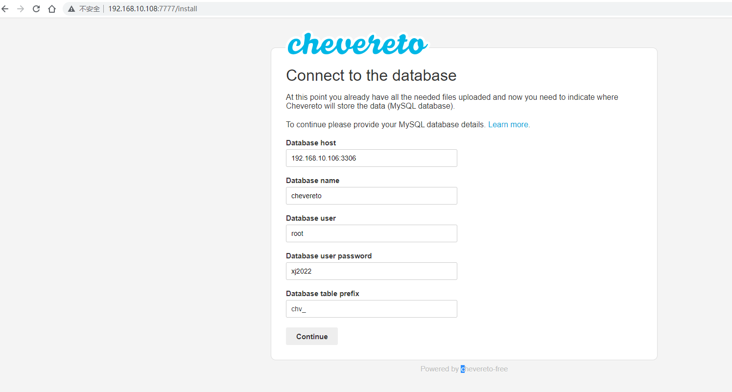 准备一个mysql数据库,如果没有mysql 数据库的话可以参考我们之前的文章 使用 Docker Compose 部署 MySQL 8.0搭建,搭建好之后创建一个数据库 chevereto