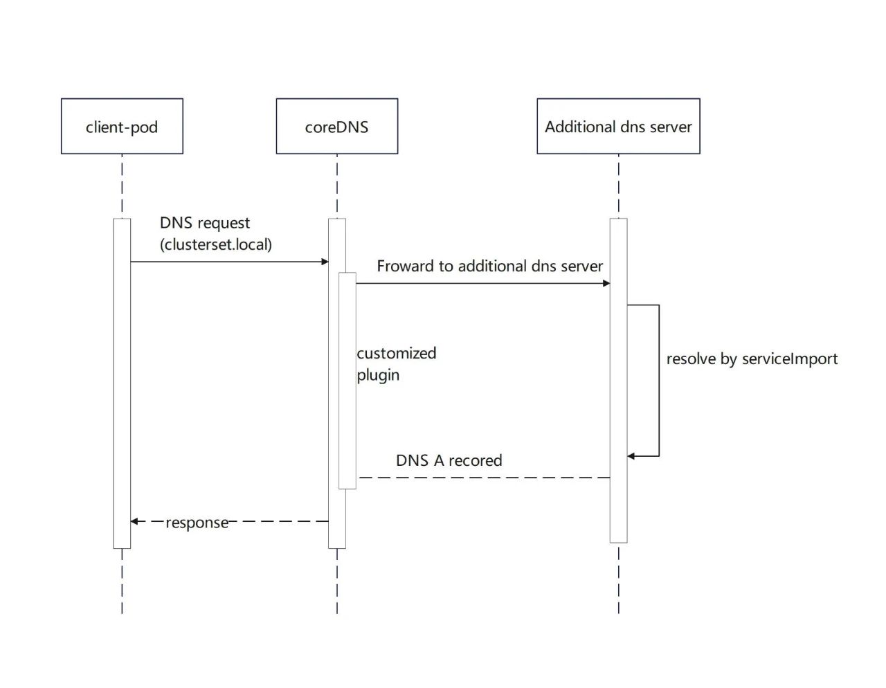 类似 submariner 的SERVICE DISCOVERY【5】的方式。需要开发一个拓展的 dns 解析器,并在 coreDNS 中安装对应的插件将带有指定后缀的域名(如 clusterset.local)转到这个 dns 扩展解析器。从而实现域名的解析。