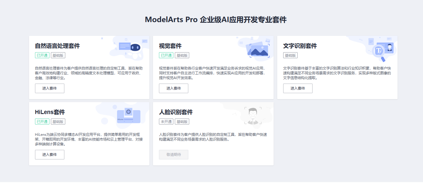 对于企业级应用而言,ModelArts pro则是更加优化的选择,在ModelArts pro中包含着各类已成型的套件,进入套件后