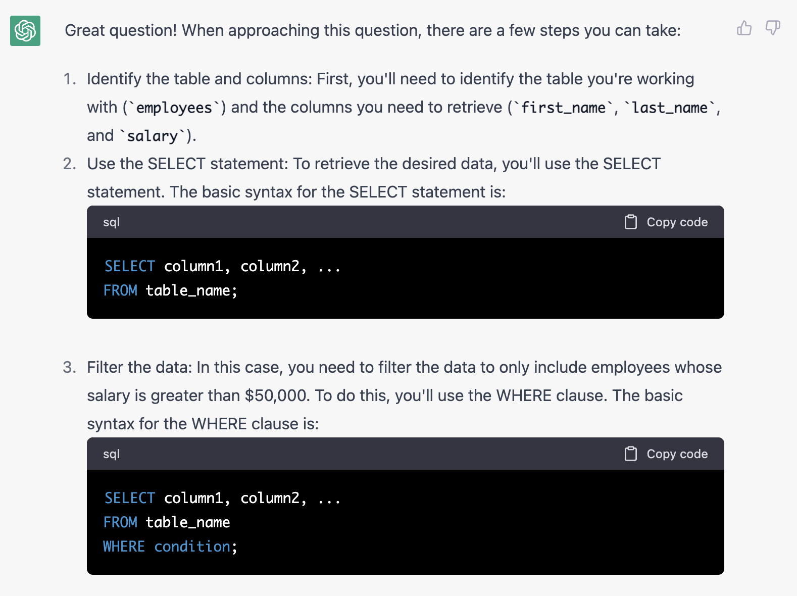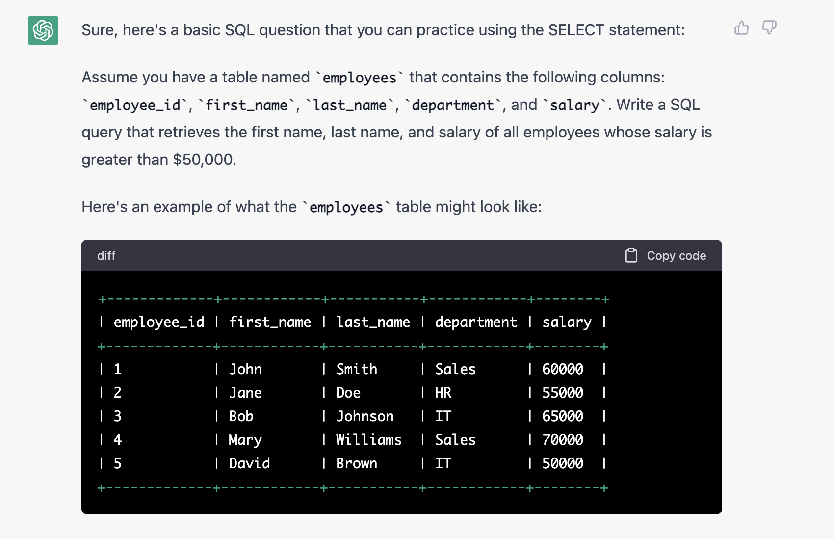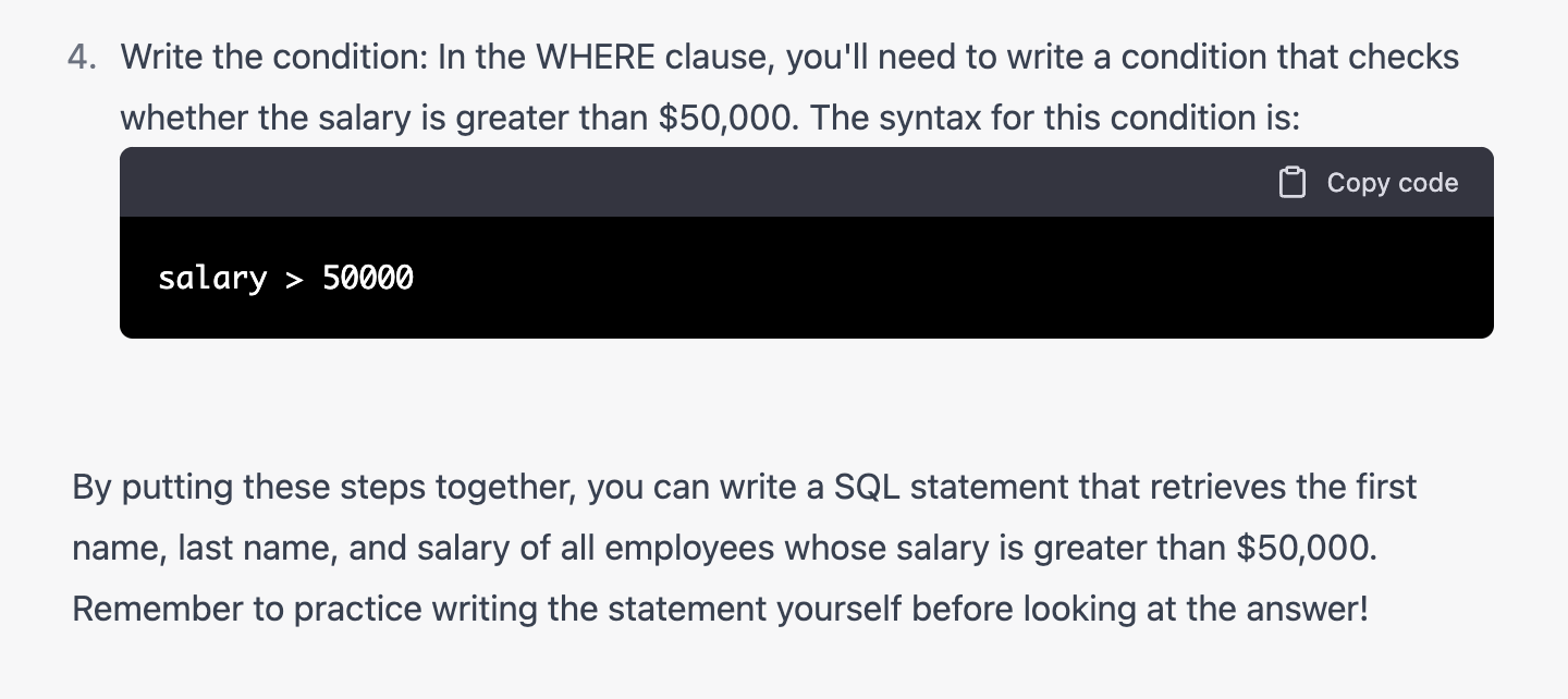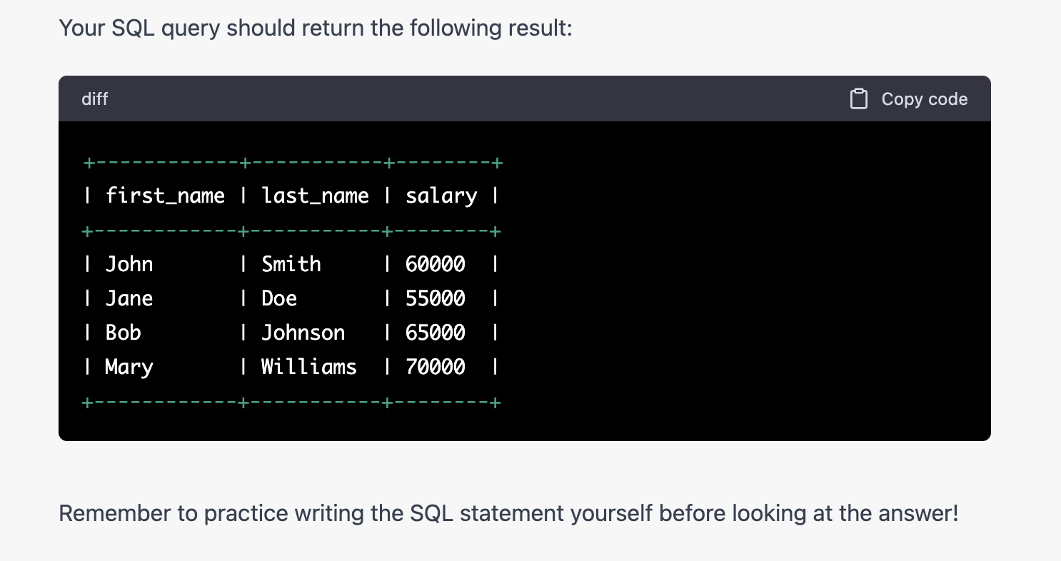 下一步的话,我们就可以开始练习啦!可以从最上面的一条SELECT开始,让ChatGPT出题目。记得让它不要给答案先哦。并且可以让它数据的时候可以给一个例子。