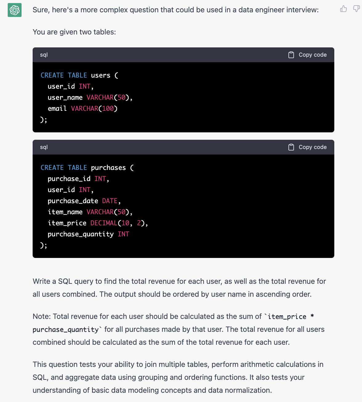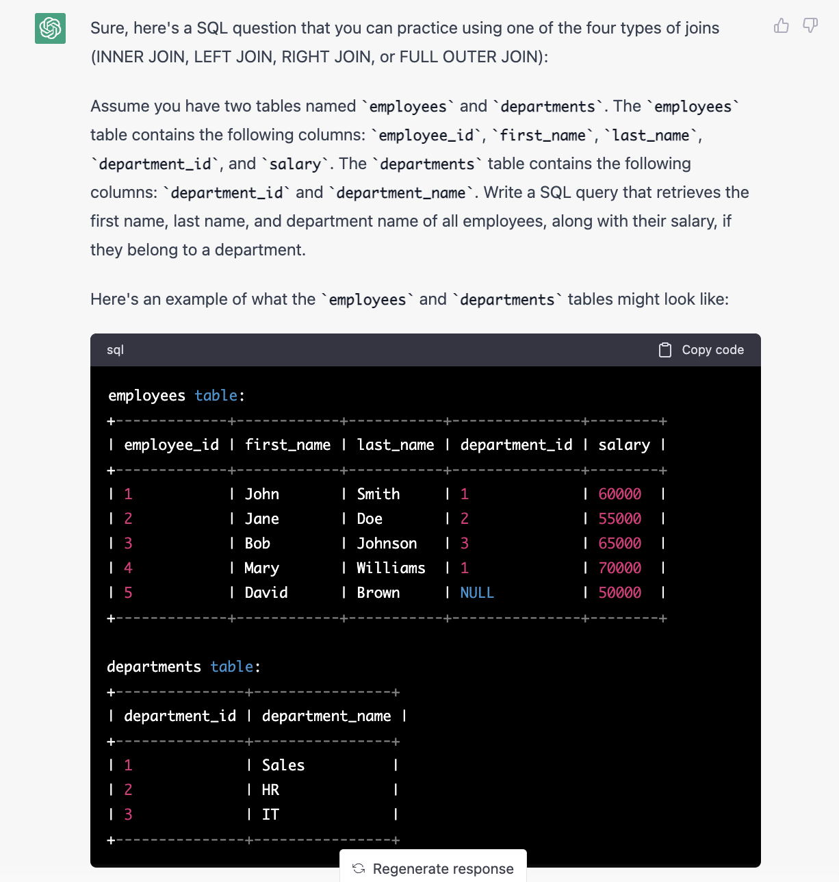 这个题目比较简单。JOIN是面试的时候经常会考到的题目,并且会考不同的JOIN之间的区别。所以我让ChatGPT给我一道JOIN的题目,但是不要告诉我是哪一种JOIN。