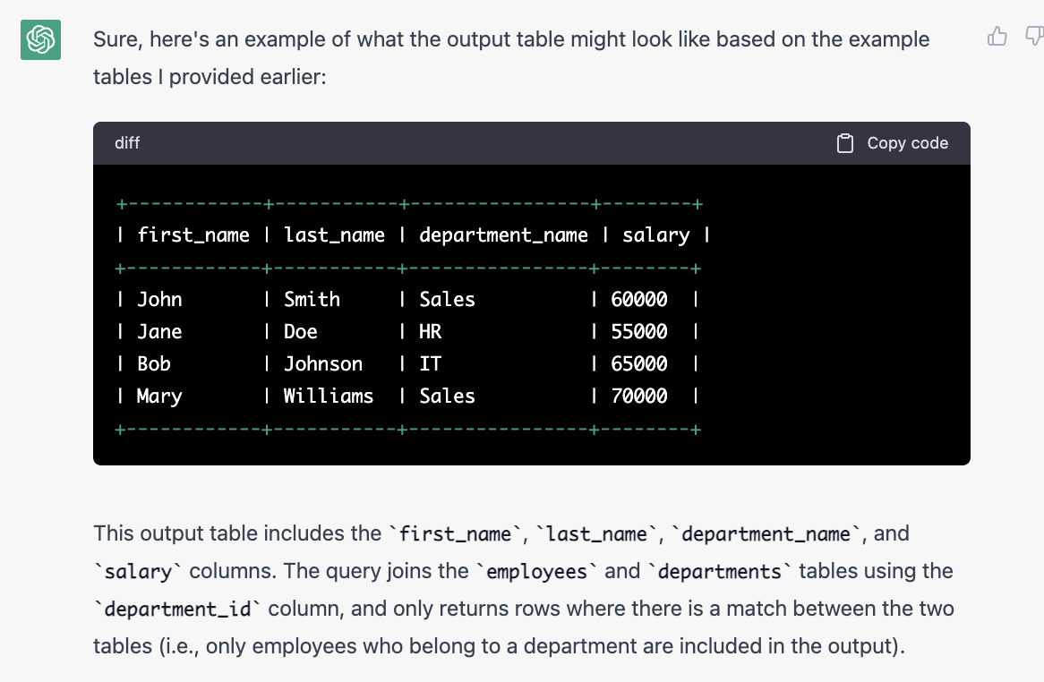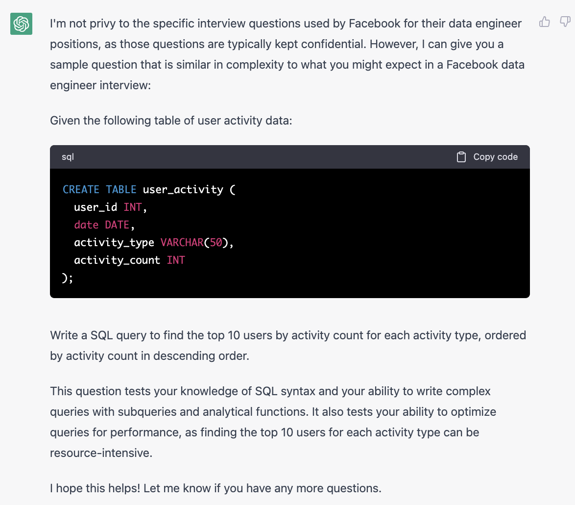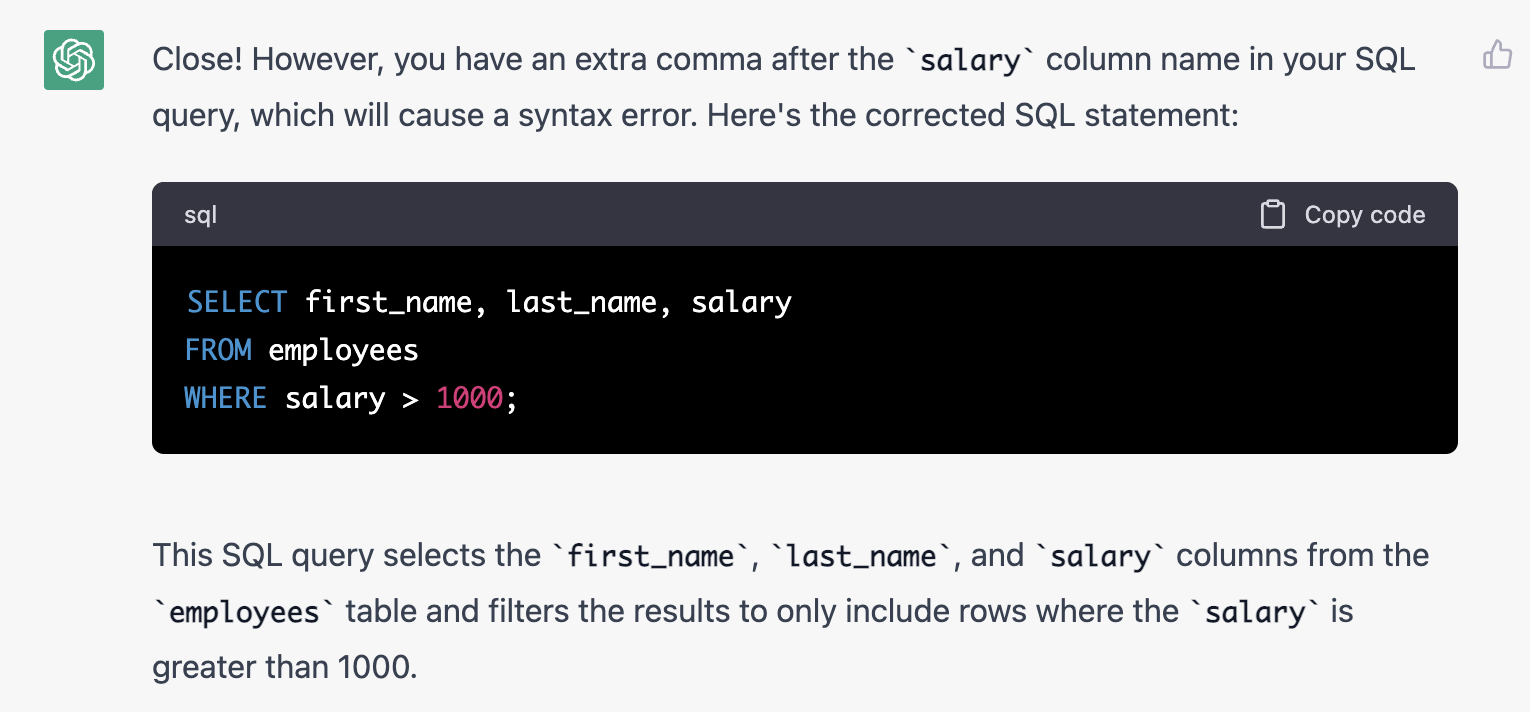 首先我问了ChatGPT它可不可以act as SQL server。它说不行。但是后面测试的时候,只要在对话框里打SQL syntax,它就可以理解啦。所以不用担心!