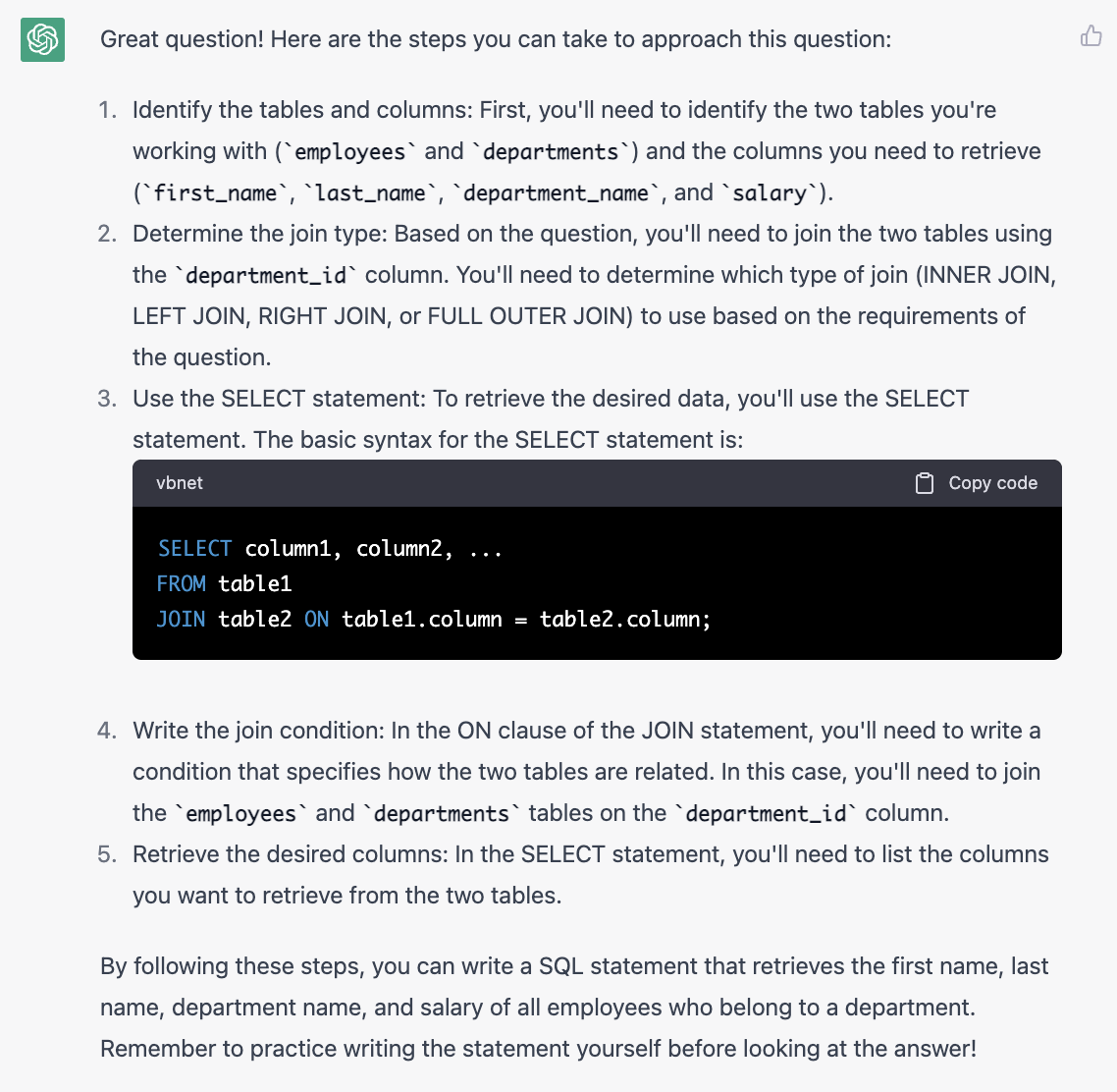 ChatGPT教得很好;SQL最主要的学习方式就是练习以及解题思路,可以让ChatGPT给很多练习题,并且让它给出如何一步步思考的过程;