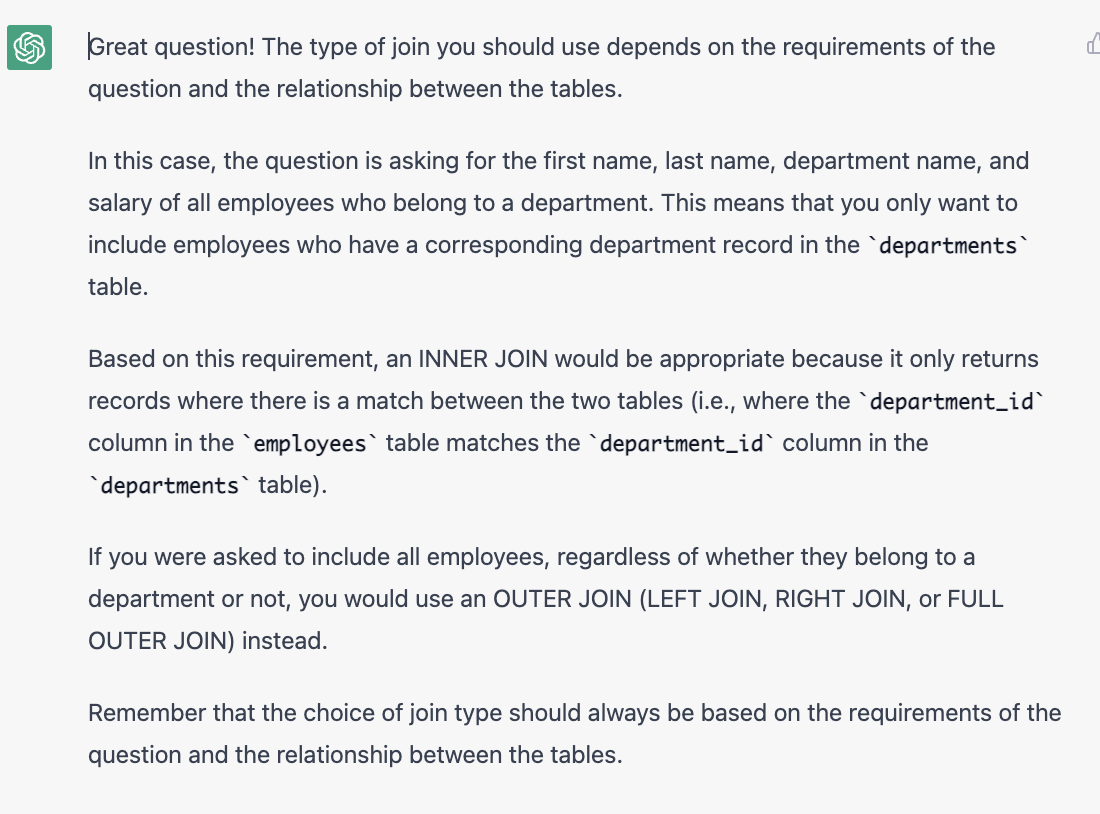 在关于JOIN的题目里,决定哪一种JOIN是最重要的一步,我们也可以问ChatGPT。