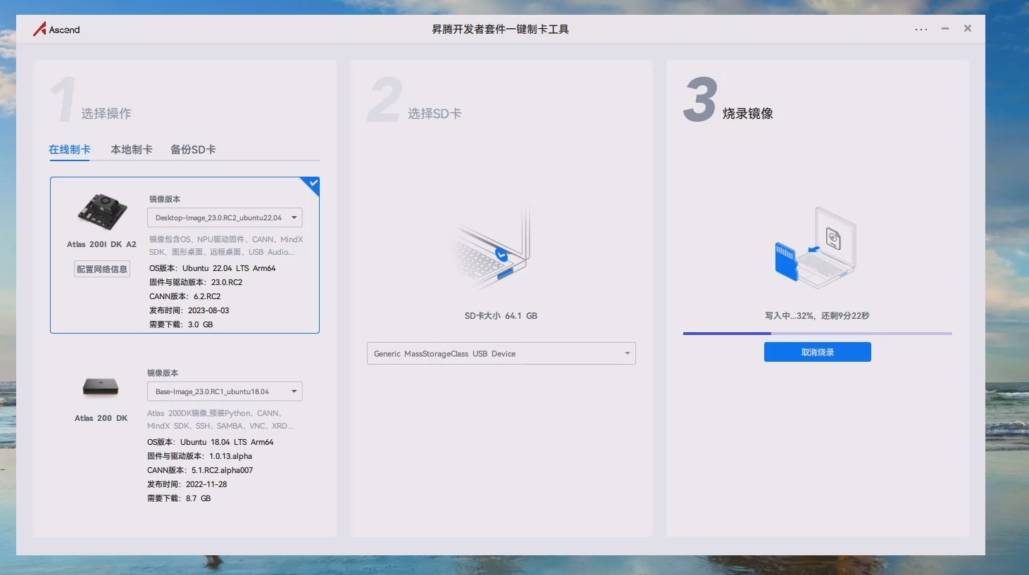 然后依据昇腾官方文档,使用一卡制作工具制作SD卡。在线制卡速度比想象中要好,而且镜像是Ubuntu22.04版本,好评。在线的好处就是随时能享受到最新的镜像资源。