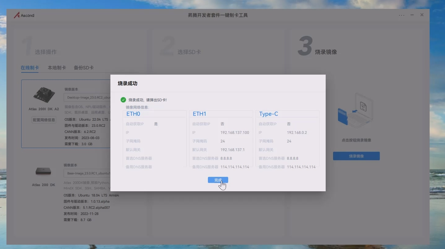 烧录成功后,会弹出窗口。这里也揭示了小滕上的接口,注意ETH1网口的IP是固定的192.168.37.100,后面我们会用到。可能Win11系统会弹出格式化SD的窗口,不用理会,点击关闭即可。我这里在线制卡总计用时20多分钟左右。