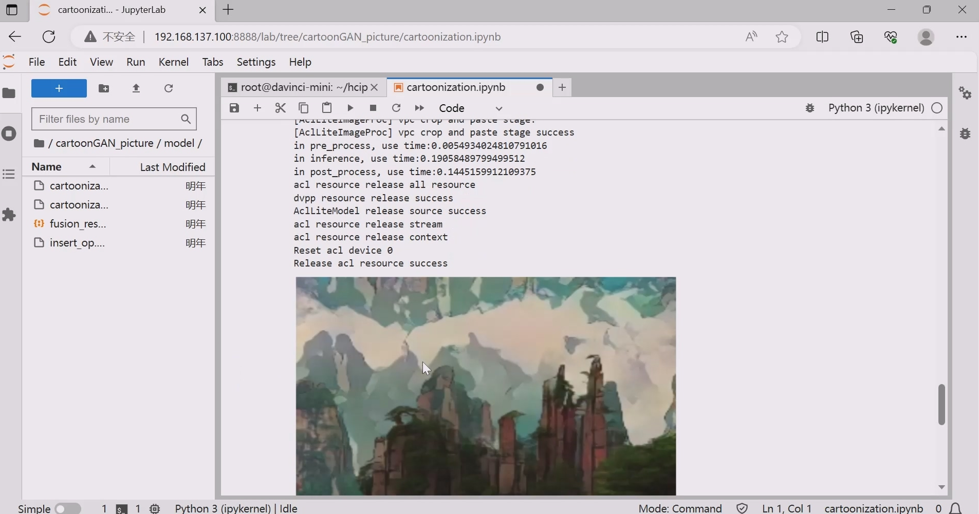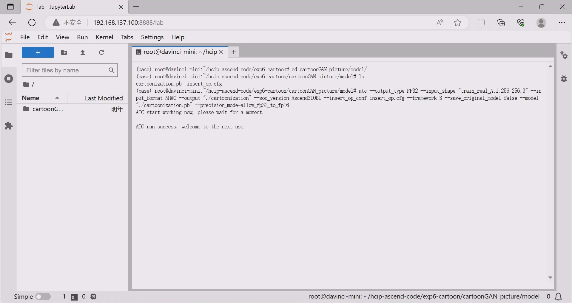跑开发板示例代码,这里我选择了卡通图像生成。先是使用atc指令执行模型转换。