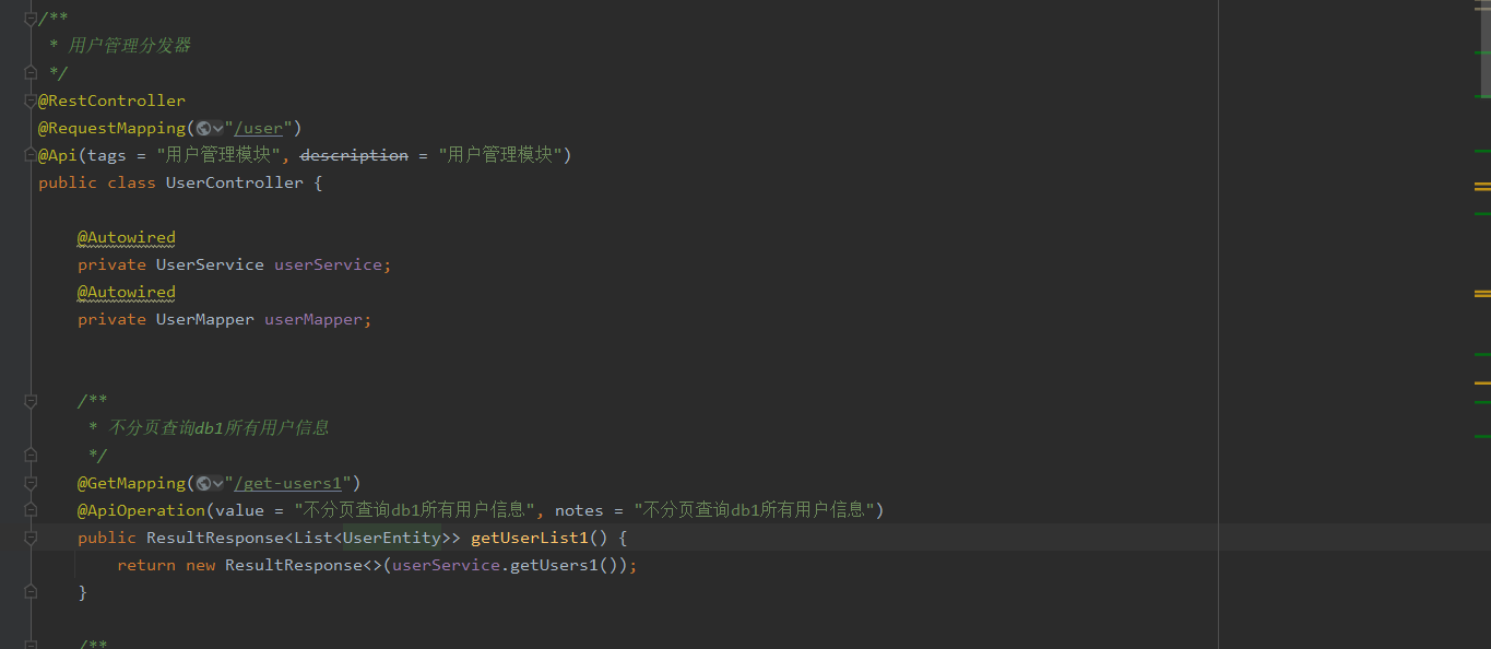 在UserController类上使用@RestController注解标识该类为控制器类,使用@RequestMapping注解来指定映射路径。示例截图如下: