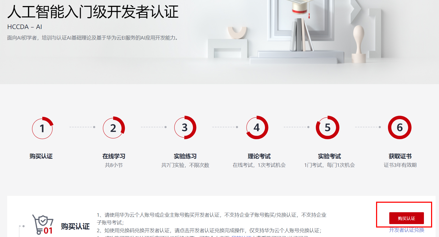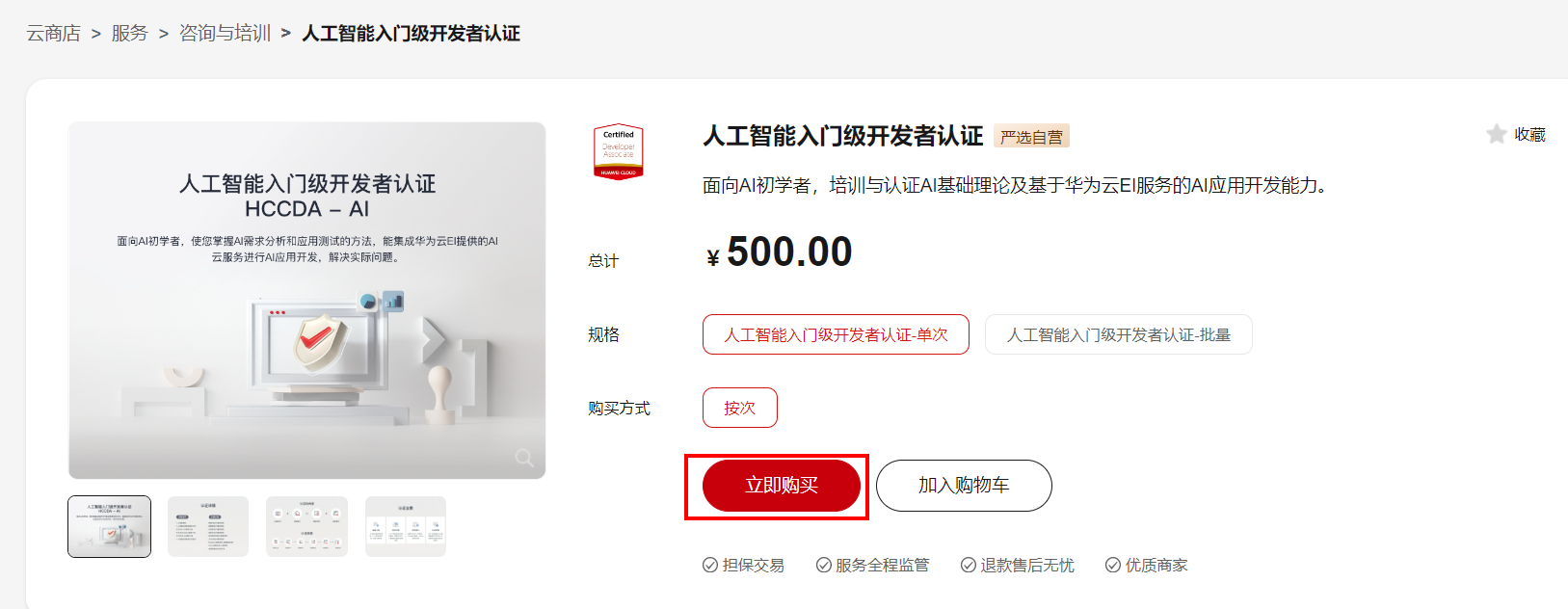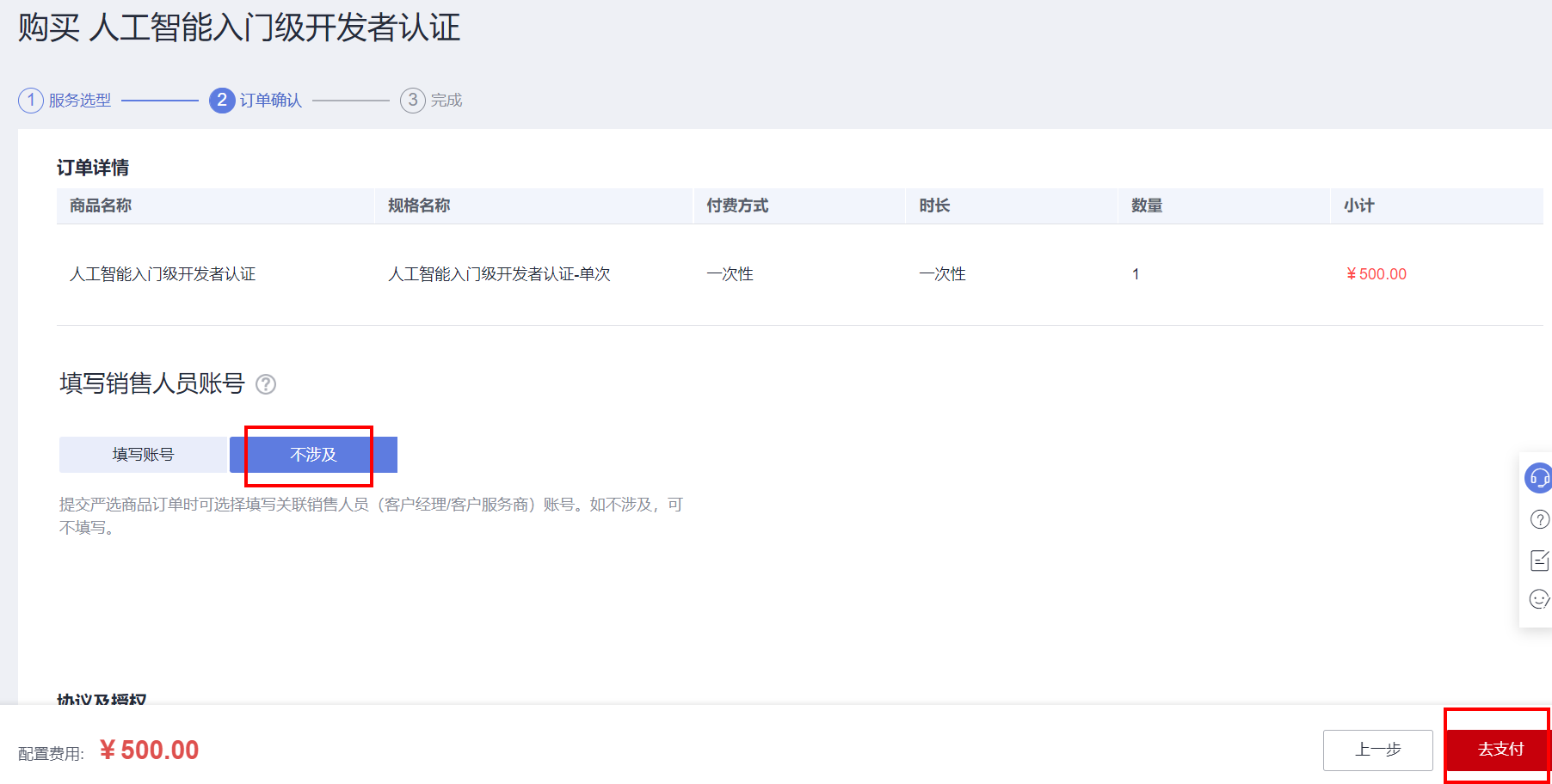 【摘要】 进入对应开发者认证详情页,点击“购买认证”。跳转进入“华为云云市场”,点击“立即购买”。销售人员账号选择“不涉及”(如有相关可填写),同意协议及授权,点击“去支付”。选择对应的代金券(如有相关认证代金券),及支付方式,确认付款。付款成功后,选择“返回我的云市场”即返回个人中心“我的开发者认证”。