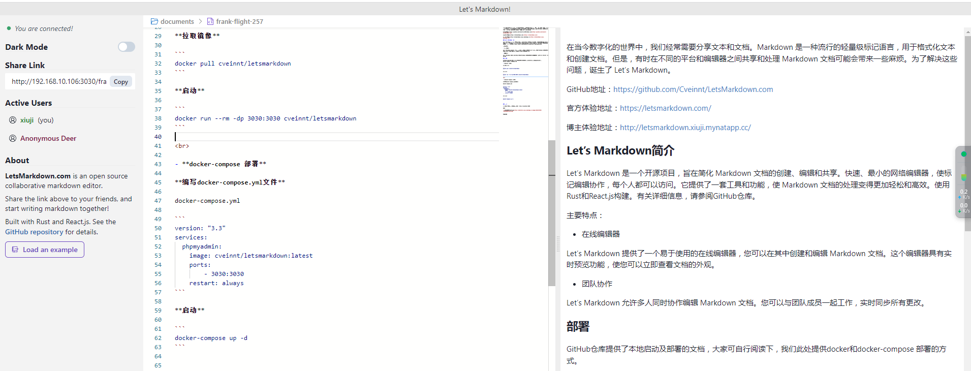 Let’s Markdown 是一个开源项目,旨在简化 Markdown 文档的创建、编辑和共享。快速、最小的网络编辑器,使标记编辑协作,每个人都可以访问。它提供了一套工具和功能,使 Markdown 文档的处理变得更加轻松和高效。使用Rust和React.js构建。有关详细信息,请参阅GitHub仓库。