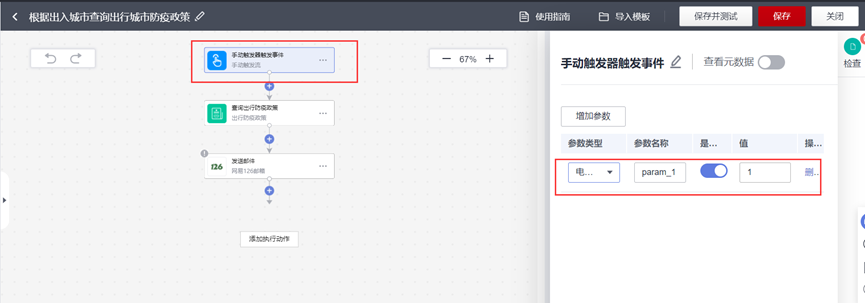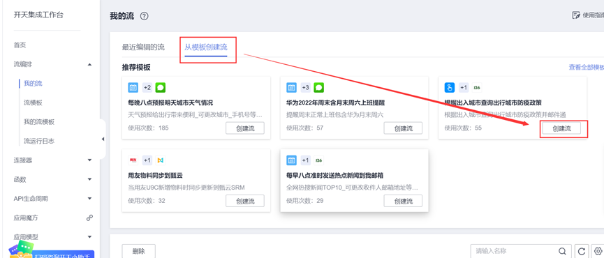 选择从模块创建流,选择根据出入城市查询城市防疫政策;