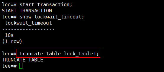 ACCESS SHARE与ACCESS EXCLUSIVE锁冲突例子:session 1 在事务内对表进行truncate,且lockwait_timeout参数设置为10s;session 2 查询该表,此时会一直等到session 1 释放锁,直到等锁超时。