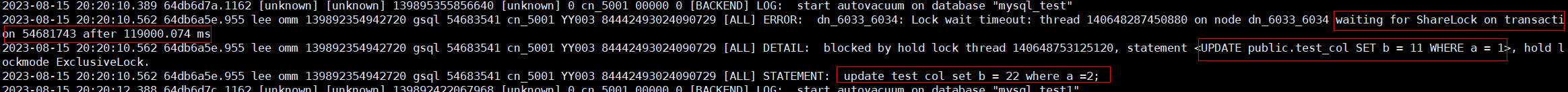 pgxc_lock_conflicts视图提供集群中有冲突的锁的信息(适合锁冲突现场还在时使用),目前只收集locktype为relation、partition、page、tuple和transactionid的锁的信息,需要关注的字段nodename(被锁定对象节点的名字)、queryid(申请锁的查询ID)、query(申请锁的查询语句)、pid、mode、granted。