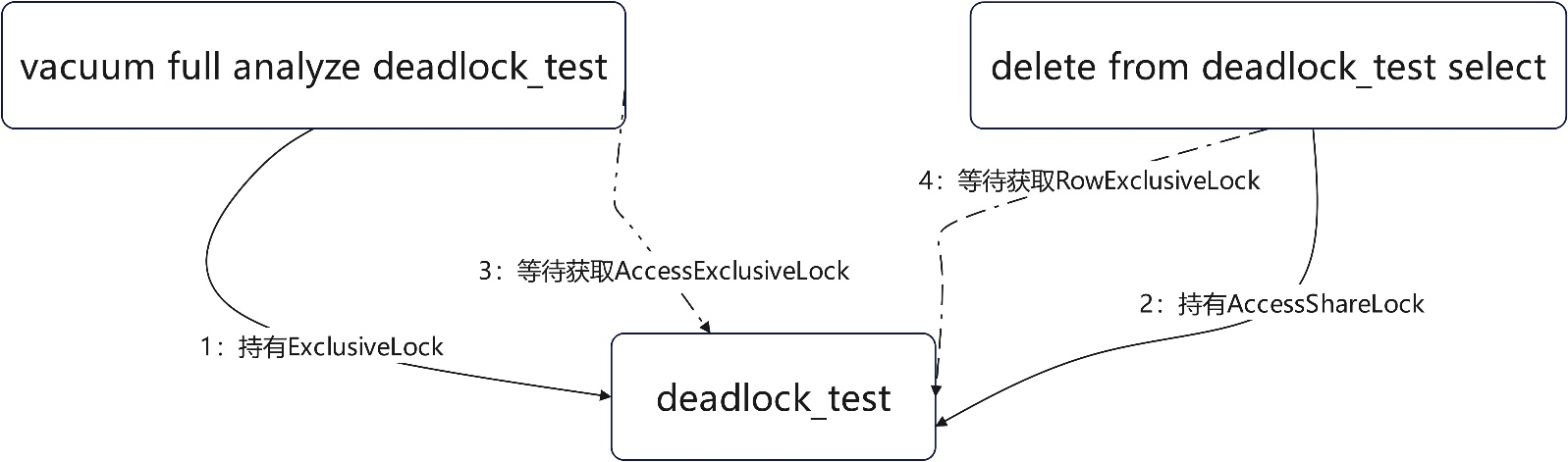 上述场景下vacuum full语句申请1:ExclusiveLock并持有,后续delete from语句申请2:cessShareLock并持有;vacuum full升级锁3:AccessExclusiveLock失败;delete from升级锁4:RowExclusiveLock失败;两个语句形成死锁。