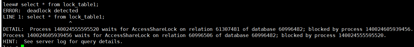 CN_5001的truncate语句线程号为:139887210493696;在等待线程号为:139887432832768的truncate语句释放lock_table1的AccessShareLock(事务中select语句持有的锁),同时该线程:139887210493696,持有lock_table1的AccessExclusiveLock;