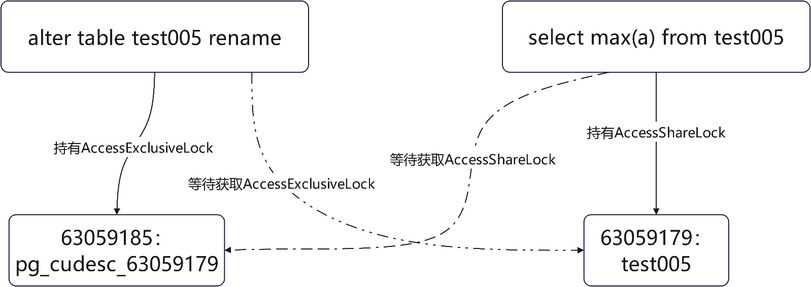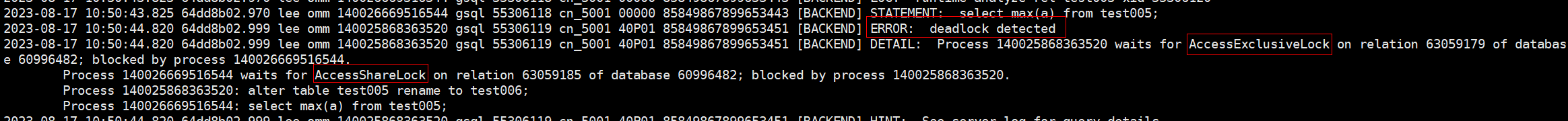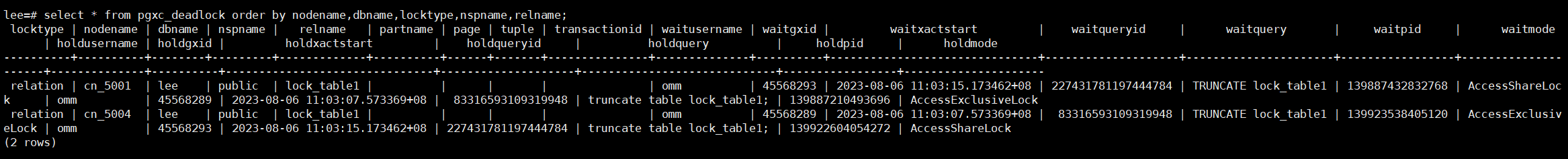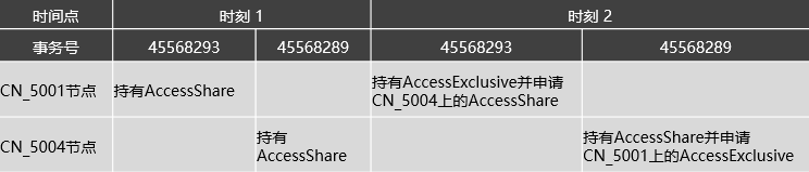 CN_5004的truncate语句线程号为:139887432832768;在等待线程号为:139887210493696的truncate语句释放lock_table1的AccessExclusiveLock;同时该线程:139887432832768持有lock_table1的AccessShareLock;这种 场景下在不同实例上分布式的等待关系,便形成了分布式死锁。