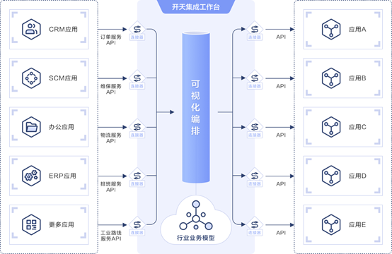 基于业务模型和API,封装成连接器,使得每个应用只需集成一次,实现X*Y*Z变成X+Y+Z。