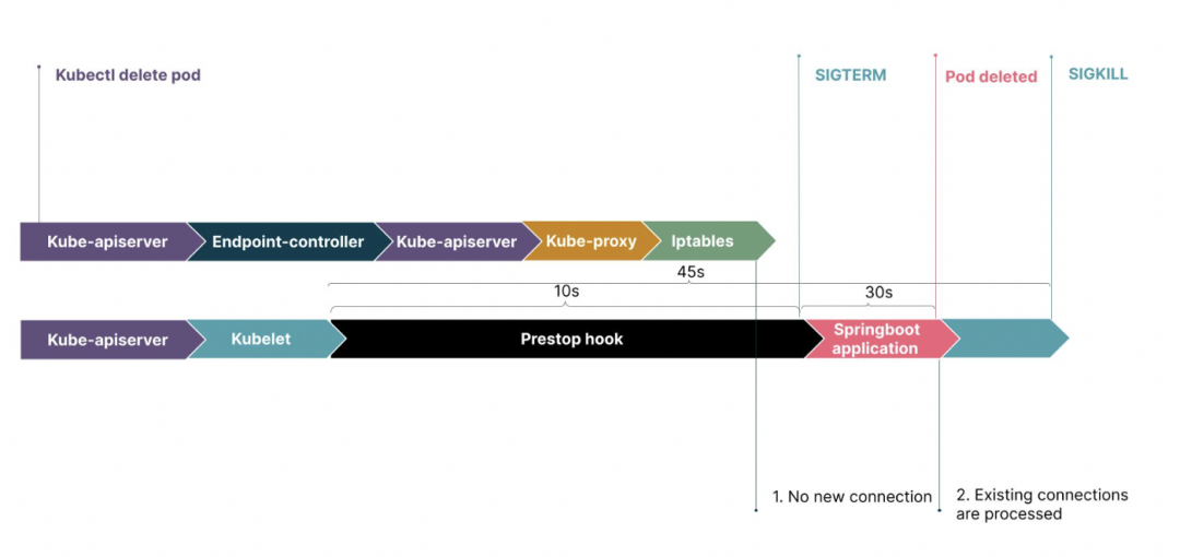 参考之前删除 Pod 的分析,Kubernetes 为容器删除留下了 30 秒的最大时间尺度。如果 Spring 的优雅关闭超时时间和 Kubernetes 的 preStopHooks 之和超过 30 秒,可能会导致 Kubernetes 在 Spring Boot 处理完请求之前强行删除容器。因此,如果过程超过 30 秒,则应将 timerminationGracePeriodSeconds 调整为超出 Spring 加 preStopHook 的优雅关闭超时。