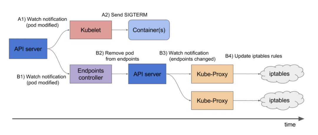 在删除 Kubernetes pod 的过程中,有两条平行的时间线,如下图所示。一是改变网络规则的时间线。另一个是 pod 的删除。