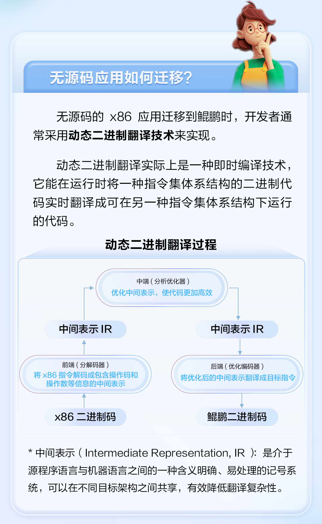 为了帮助广大用户和开发者快速将无源码应用从 x86 迁移到鲲鹏,鲲鹏 DevKit提供了动态二进制翻译工具ExaGear,它能在运行时将x86二进制指令翻译成鲲鹏二进制指令,使得大部分x86应用无需重新编译即可运行在 ARM64服务器上,性能损耗最低10%。