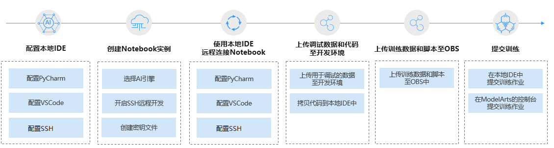 ModelArts支持通过本地IDE远程连接到云上的Notebook中,开发基于Pytorch、Tensorflow和MindSpore引擎的AI模型:👉具体操作指导参考