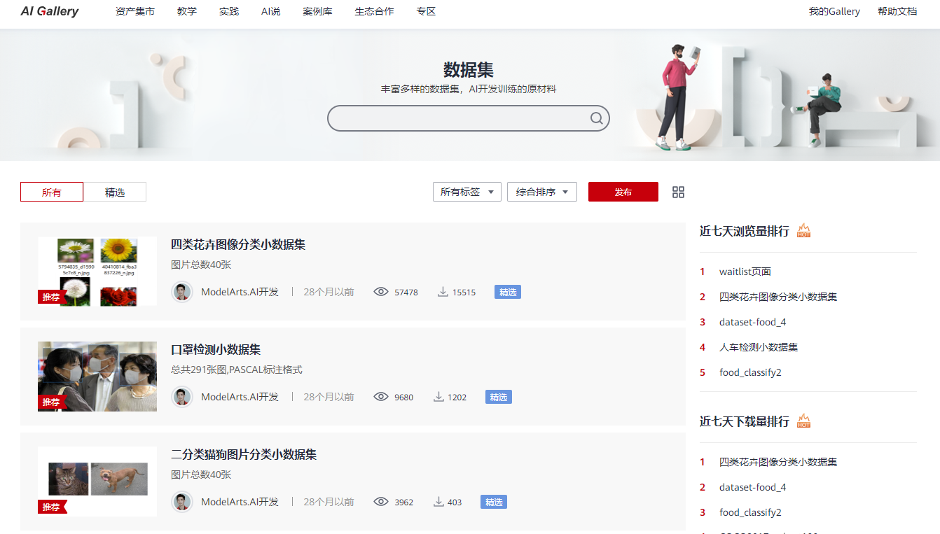 数据集公开在AI Gallery上,一部分是常见的公开数据集,如ImageNet、COCO、CitySpaces、Imdb情感分析等;一部分是华为云以往的AI比赛中使用的数据集,如无人车比赛的交通标志识别、疲劳驾驶检测比赛的视频、OCR比赛的中英文购物小票等;最后就是开发者自发上传的各式数据集。可以去👉AI Gallery逛逛。