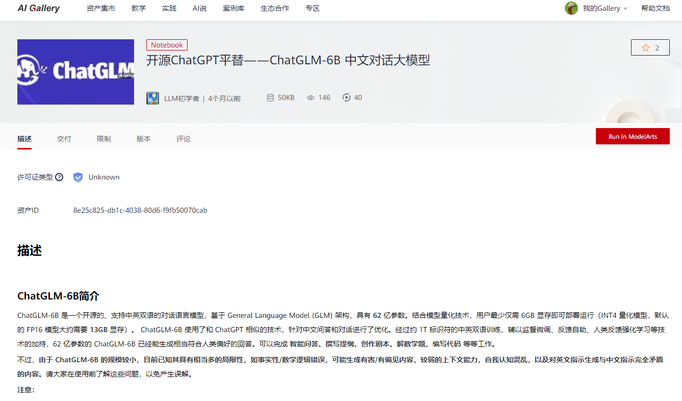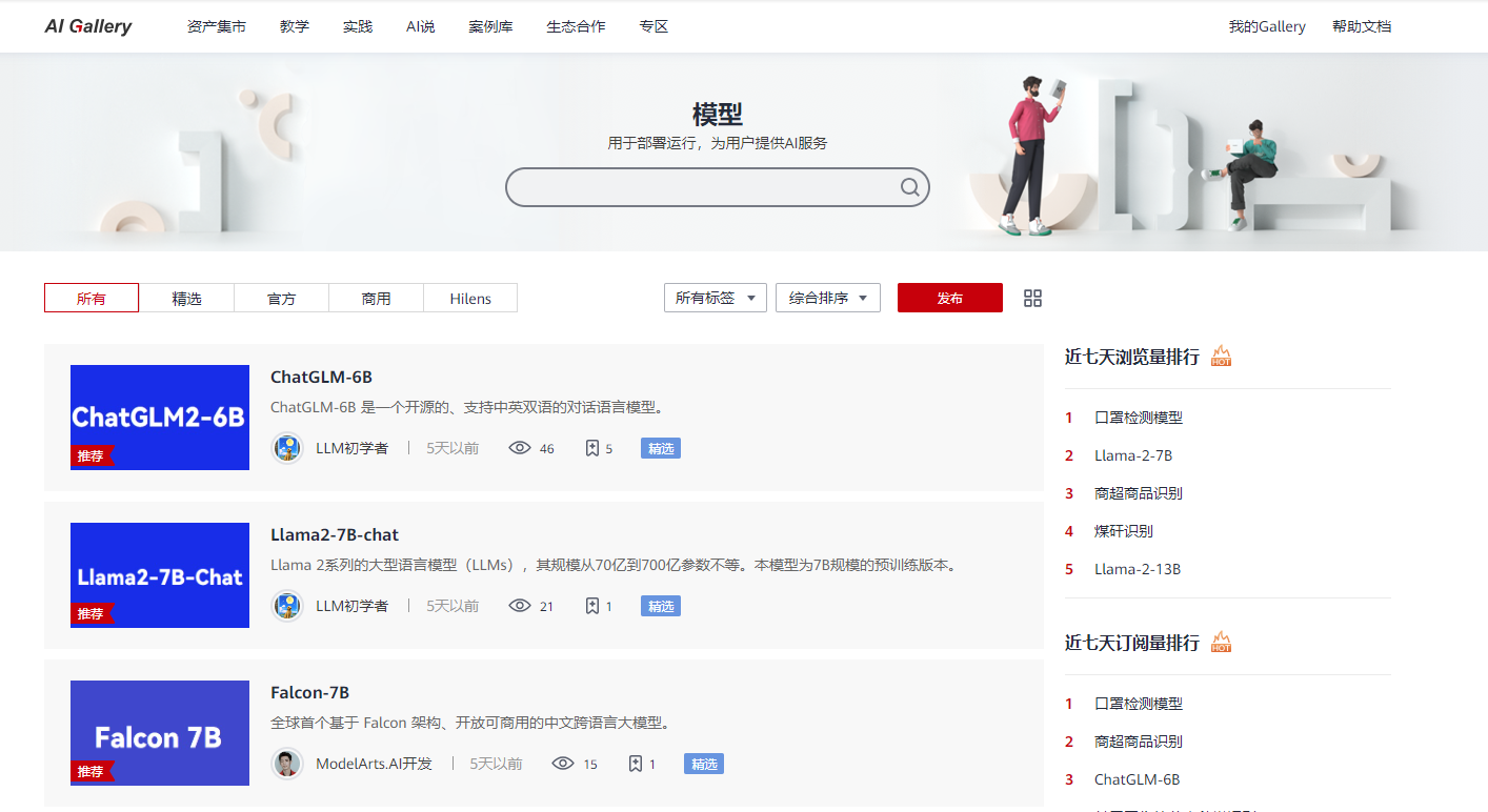 模型资产发布在AI Gallery中,大部分没有公开权重,但是可以在ModelArts上部署使用,如往届华为云AI大赛的优秀作品;另外值得一提的是,最近火爆的开源大模型也陆续上架到AI Gallery中,如Stable Diffusion、MPT、Falcon等。