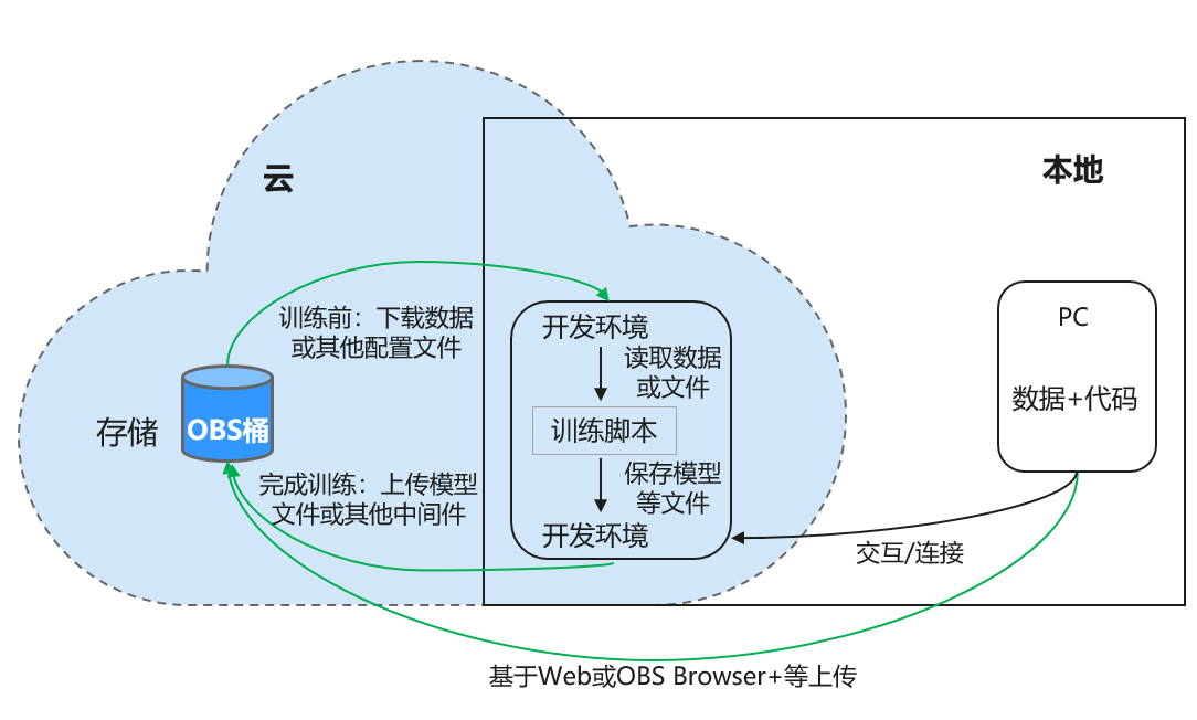 2、如果是正式的训练/推理作业,需要适配ModelArts的规范,建议也是先参考1在Notebook里调通,再创建正式作业,需要注意的点是云上作业存储用的是华为云OBS(代码/数据需要先传到OBS),相关的规范可参考👉参考1;👉参考2