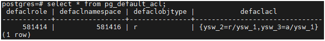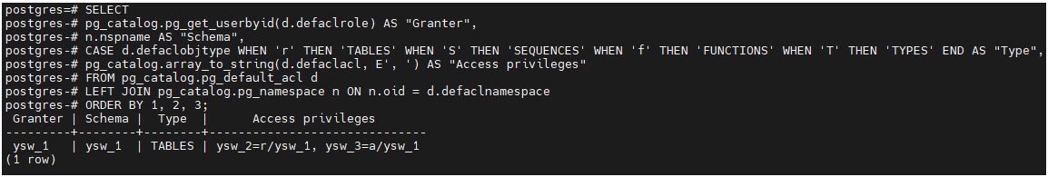 ALTER DEFAULT PRIVILEGES FOR USER ysw_1 IN SCHEMA ysw_1 GRANT SELECT ON TABLES TO ysw_2;