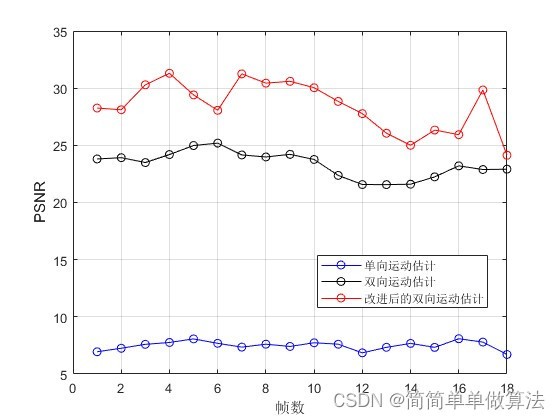 legend('单向运动估计','双向运动估计','改进后的双向运动估计');
