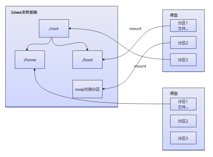 Linux系统无论多少分区,最终只有一个根目录,独立且唯一,Linux的每个分区用来组成整个文件系统的一部分。Linux使用一种载入处理方式,可将一个分区和一个目录联系起来,这样载入的分区将使存储空间在一个目录下获得。磁盘分区原理图,如下图所示: