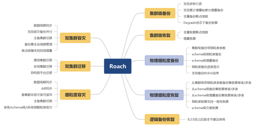 GaussDB(DWS)的备份恢复工具—Roach,提供了备份、恢复、容灾功能。备份恢复部分包括集群级备份、集群级恢复、物理细粒度备份、物理细粒度恢复、逻辑备份和恢复;容灾部分包括双集群容灾、双集群迁移、细粒度容灾。