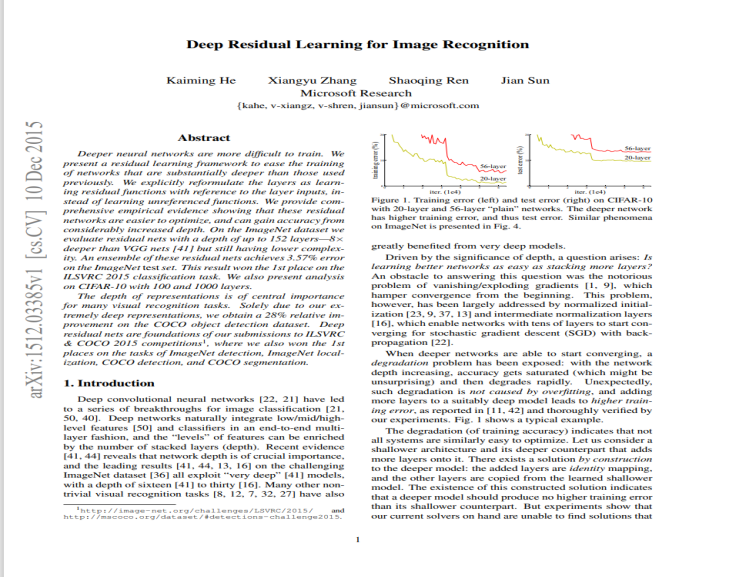 ResNet是何凯明等人在2015年提出的一种网络结构。ResNet又名残差神经网络,指的是在传统卷积神经网络中加入残差学习(residual learning)的思想,解决了深层网络中梯度弥散和精度下降(训练集)的问题,使网络能够越来越深,既保证了精度,又控制了速度。以下是论文第一页。