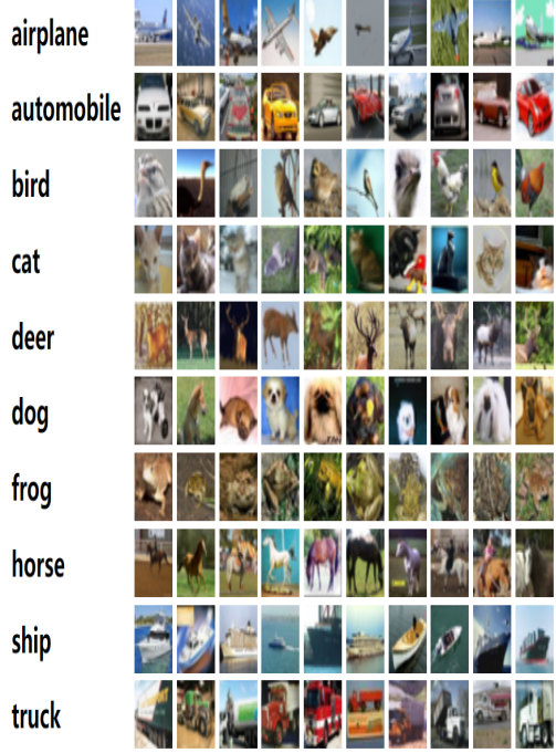 1. cifar10数据集下载链接:http://www.cs.toronto.edu/~kriz/cifar.html,下载二进制版本。 2. 里面有airplane,automobile,bird,cat,deer,dog,frog,horse,ship,truck的图片。