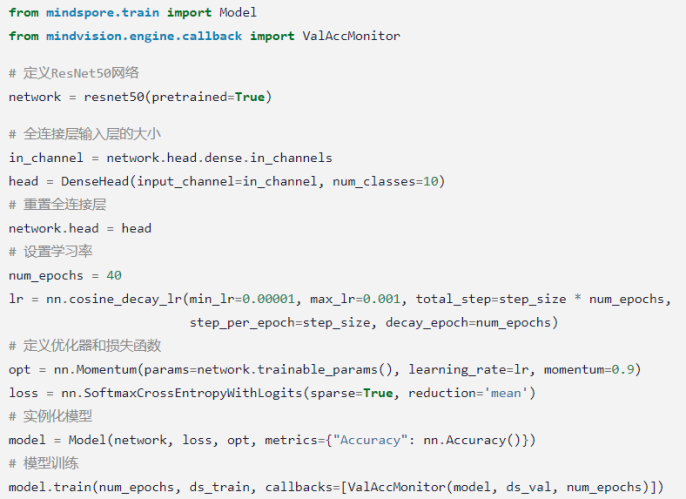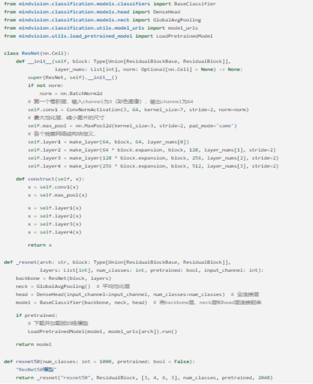 其次我们进行ResNet50模型的构建,通过用调函数resnet50即可构建。代码如下: