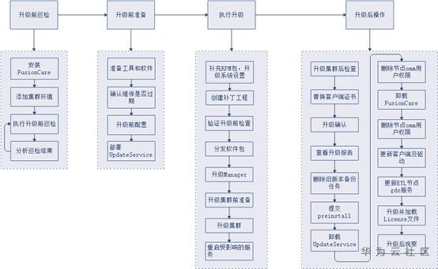 升级总体流程包括:升级前巡检,升级前准备,升级集群,升级集群后操作。