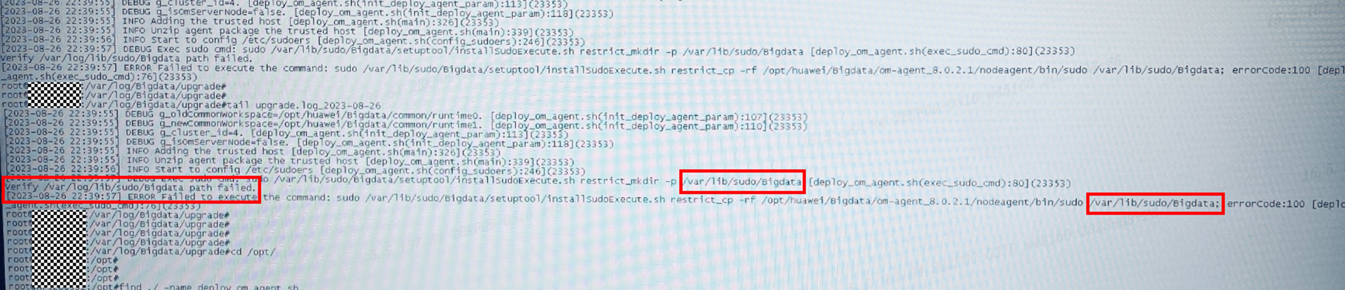 分析:DeployOMAgent步骤失败,查看失败节点的日志/var/log/Bigdata/upgrade/upgrade.log,验证目录失败。入参为/var/lib/sudo/Bigdata,但是验证打印结果未verify /var/log/lib/sudo/Bigdata path failed。