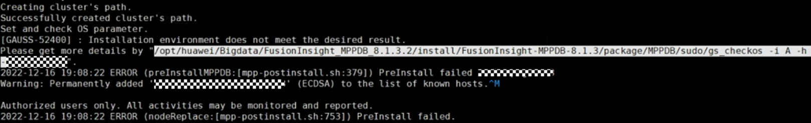 分析:内核前置失败,登入集群第一个数据节点查看日志:/var/log/Bigdata/mpp/scriptlog/postinstall.log,报错执行gs_checkos检查未通过,后台手动执行gs_checkos -i A命令,查看异常项,执行gs_checkos -i B进行修复,修复后重试即可