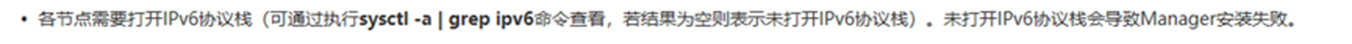 解决方案:排查OS是否已开启ipv6,sysctl -a | grep ipv6,若未开启ipv6,需要排查OS并开启ipv6,否则manager无法升级成功