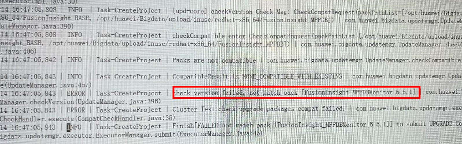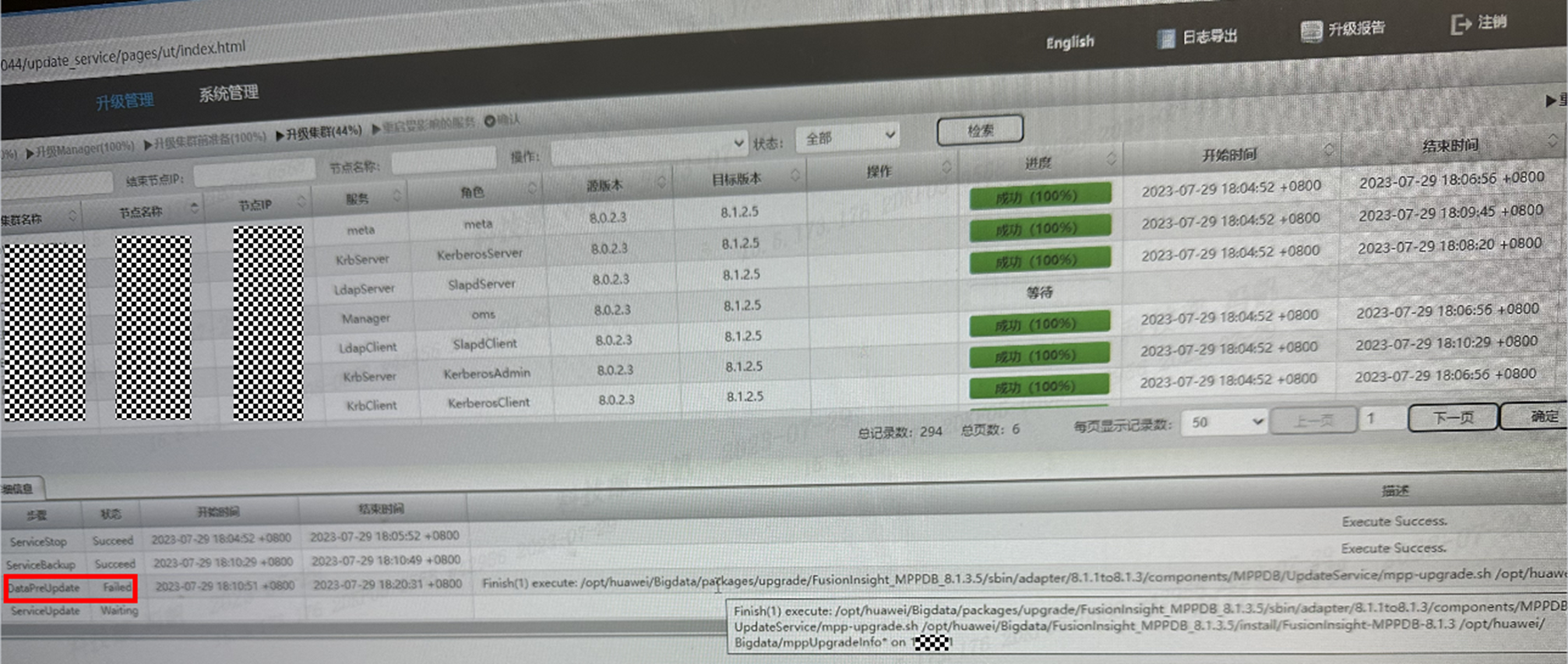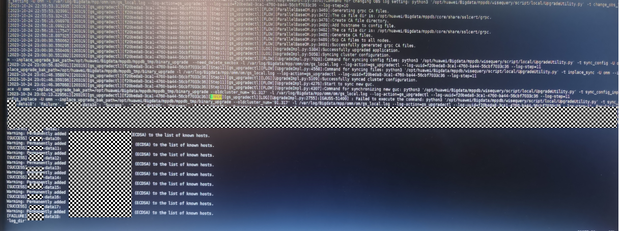 分析:DataPreUpdate步骤失败,此步骤已执行到内核升级,登入失败节点查看内核升级日志/var/log/Bigdata/mpp/omm/om/gs_upgradectl-xxxx.log及/var/log/Bigdata/mpp/omm/om/gs_local-xxxx.log