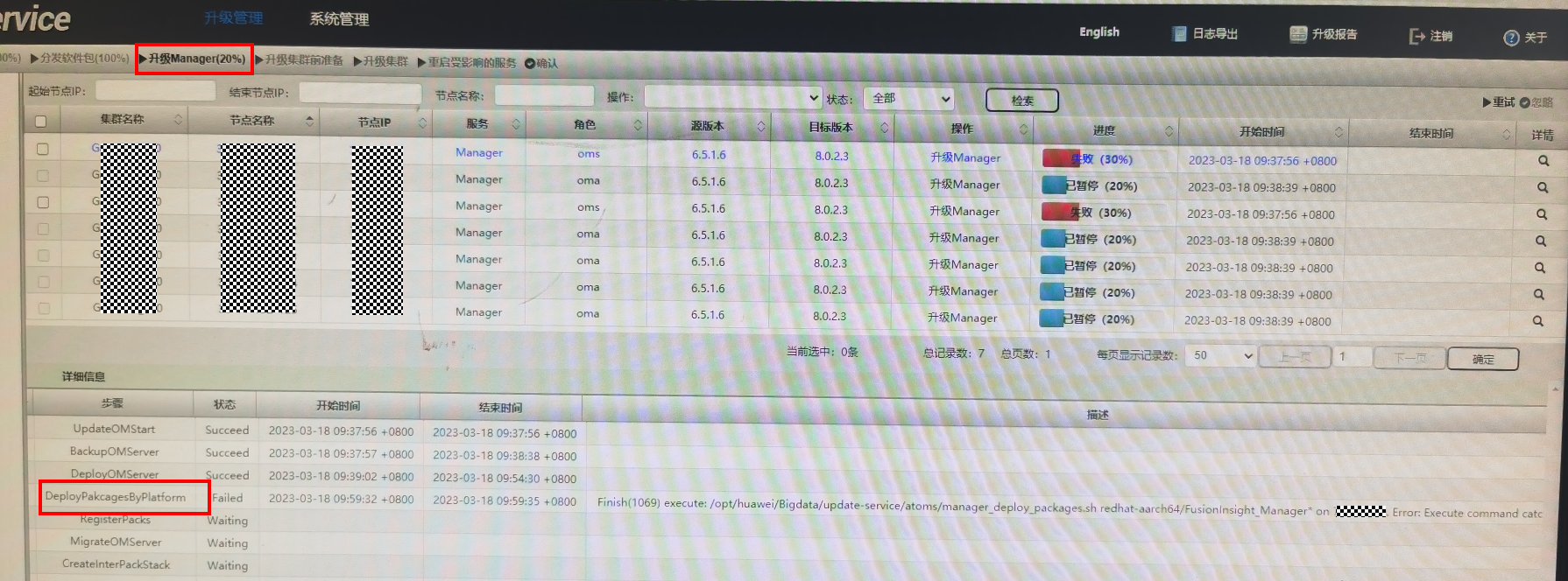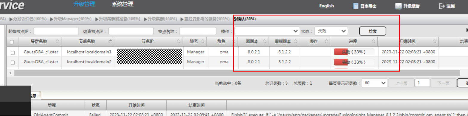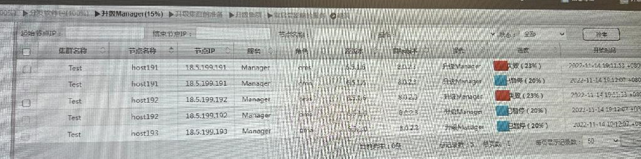升级工程几个关键步骤有升级manager、升级集群前准备、升级集群、提交。如果过程中报错,日志分析一般顺序为: