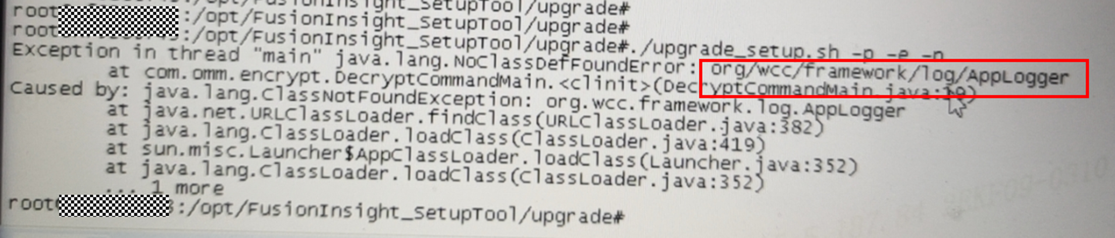 分析:Exception in thread "main" java.lang.NoClassDefFoundError: org/wcc/framework/log/AppLogger。此报错为升级前未使用升级包自带的setuptool工具包导致